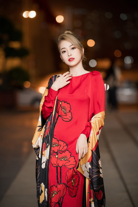 Á hậu Phương Nga cực kỳ lạ lẫm với bộ cánh này. Tuy không phô diễn đường cong nhưng có thể nói đây là một trong những lần xuất hiện lạ mắt của cô.