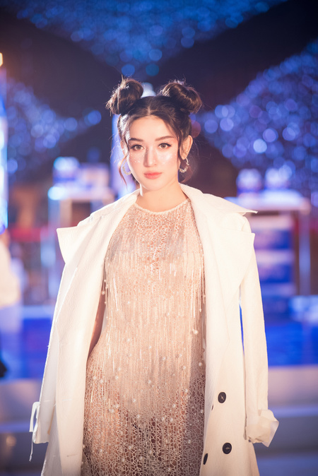Huyền My thu hút sự chú ý khi thả dáng cùng mẫu đầm xuyên thấu, đính hạt lấp lánh mà không gây cảm giác phô phang.