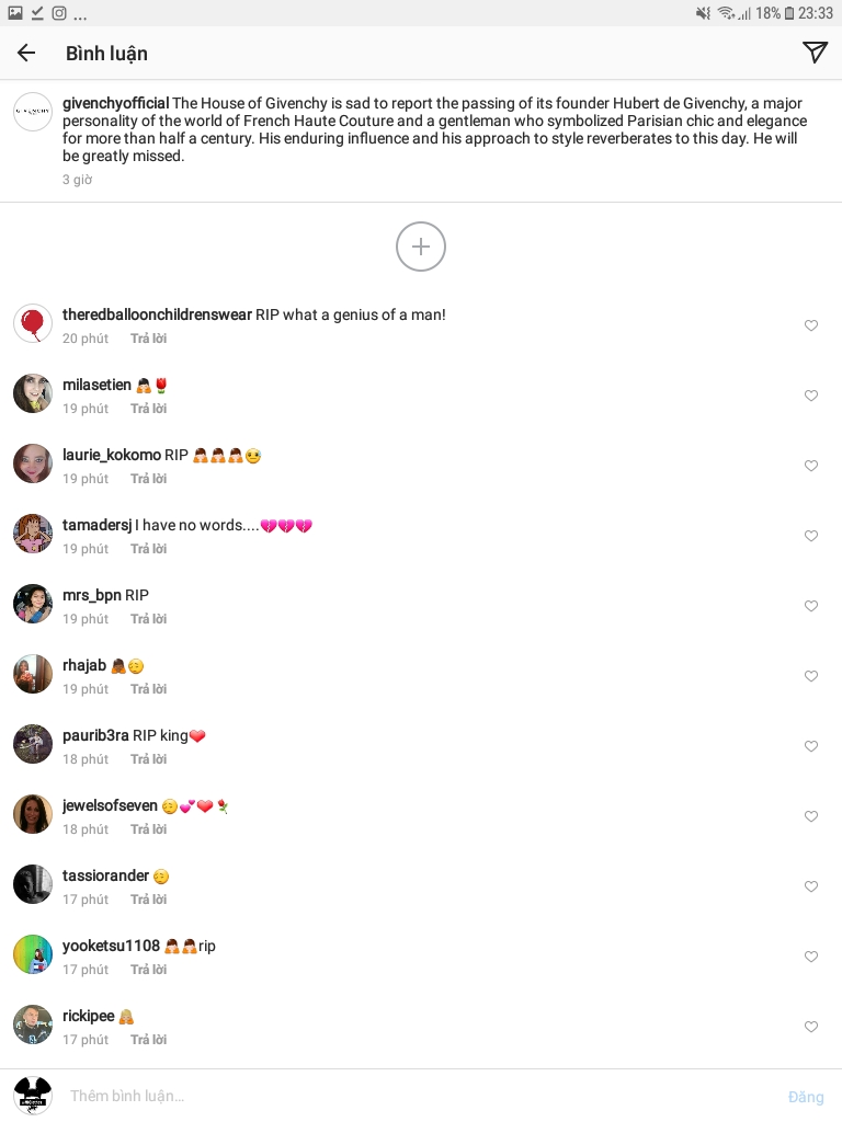 Rất nhiều tín đồ thời trang đã để lại những dòng bình luận với ngụ ý tiếc thương cho NTK tài hoa, có người bảo rằng, đối với họ, ông như một vị vua, có người lại không thể thốt nên lời.