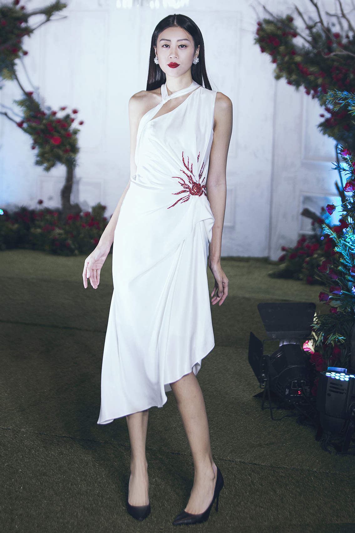 Với khuôn ngực đầy đặn cùng làn da trắng sứ, hoa hậu Jolie Nguyễn vô cùng gợi cảm trong chiếc đầm hai dây đính hoa 3D cầu kì.