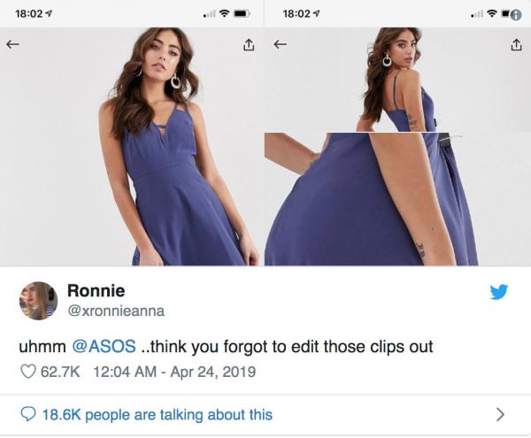Người mẫu của hãng thời trang ASOS đã bị phát hiện đang đeo 2 chiếc kẹp giấy để thắt chặt chiếc váy hai dây quanh eo. Có thể size của chiếc váy quá to so với cô mẫu hoặc chỉ đơn giản ASOS đang có ý lừa khách hàng rằng chiếc váy này mặc lên trông sẽ ôm sát, vừa vặn vòng eo của mọi cô gái.Điều này khiến các khách hàng của nhãn hàng này khó chịu và lên tiếng cho rằng một thương hiệu lớn mà quá cẩu thả trong việc chụp hình các sản phẩm thời trang đến người tiêu dùng.