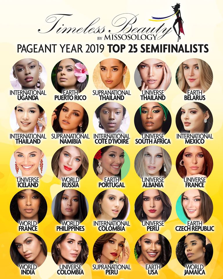 Trong top 25 gương mặt xuất sắc nhất Timeless Beaty 2019, Miss Universe chiếm áp đỏa với 7 đại diện, Miss World - Miss Earth - Miss International mỗi cuộc thi có 5 đại diện, Miss Supranational có 3 đại diện.