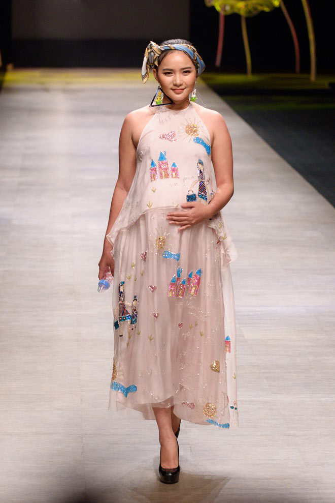 Mỹ nhân khác cũng từng khiến fan thót tim khi thả dáng catwalk dù đang mang bầu là Diệu Huyền. Không chỉ vậy, cô còn chọn chiếc váy dài, xòe rộng phủ chấm gót.