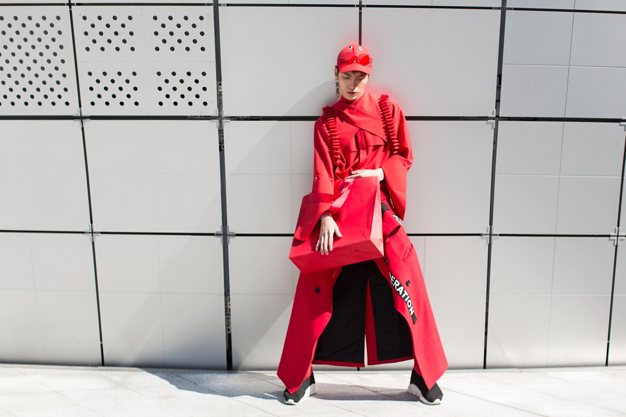 Set đồ màu đỏ tôn vinh cá tính và khiến người đối diện không thể rời mắt. Điểm độc đáo của bộ trang phục là shopping bag, thay vì dùng túi hiệu như các fashionista khác.