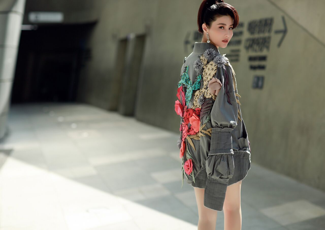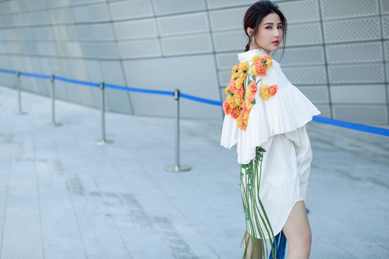 Thiết kế gam trắng điểm hoạ tiết hoa sau lưng áo giúp diễn viên Tốc độ và đường cong nổi bật trên những con phố gần sự kiện.
