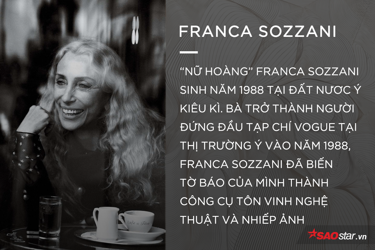 Tổng biên tập 63 tuổi này chính là người tạo ra “cơn sốt” về siêu mẫu trong làng thời trang vào đầu những năm 90. Với hai bộ ảnh The Black Issue nhằm tôn vinh vẻ đẹp của người mẫu da màu và Makeover nói về tình trạng bùng nổ của phẫu thuật thẩm mỹ, Franca Sozzani cùng nhiếp ảnh gia Steven Meisel đã vượt qua được hàng loạt tên tuổi lớn trong ngành như Bruce Weber, Peter Lindbergh hay Paolo Roversi. Mới đây, bà còn được nhận không ít giải thưởng từ bộ ảnh Rebrading Africa đăng trên tờ L'Uôm Vogue.