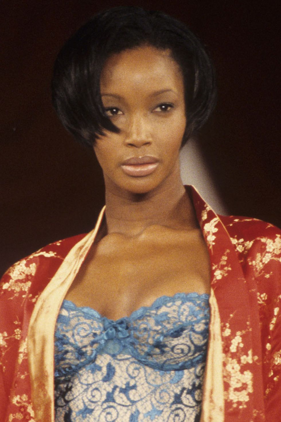 Siêu mẩu Naomi xuất hiện đằng sau cánh gà năm 1997 với tóc xoăn dài, môi tô son bóng và lông mi dày.