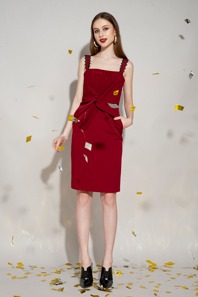 Đẩm đỏ đô hai dây bản lớn với chi tiết xoắn eo che bụng mỡ rất hợp cho nữ công sở