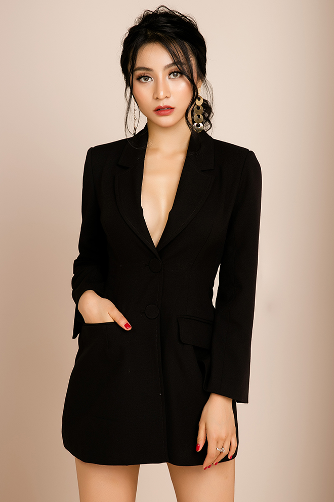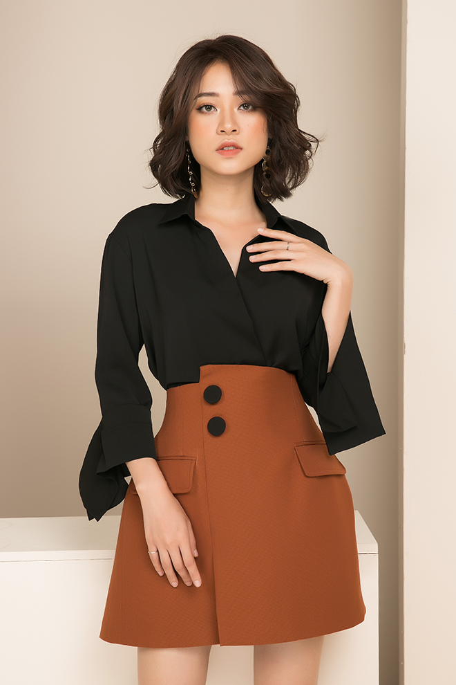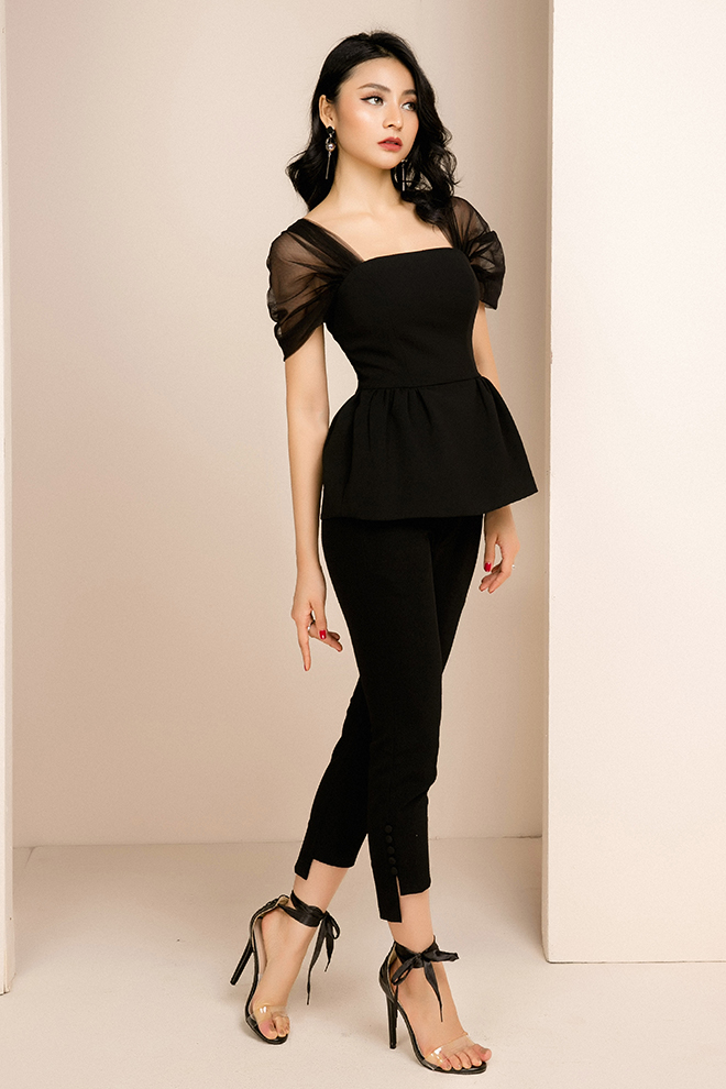Váy dạng vest quấn vạt ngắn ngang đùi tone màu đen , tay đắp voan là một ý tưởng tuyệt vời cho thu đông,