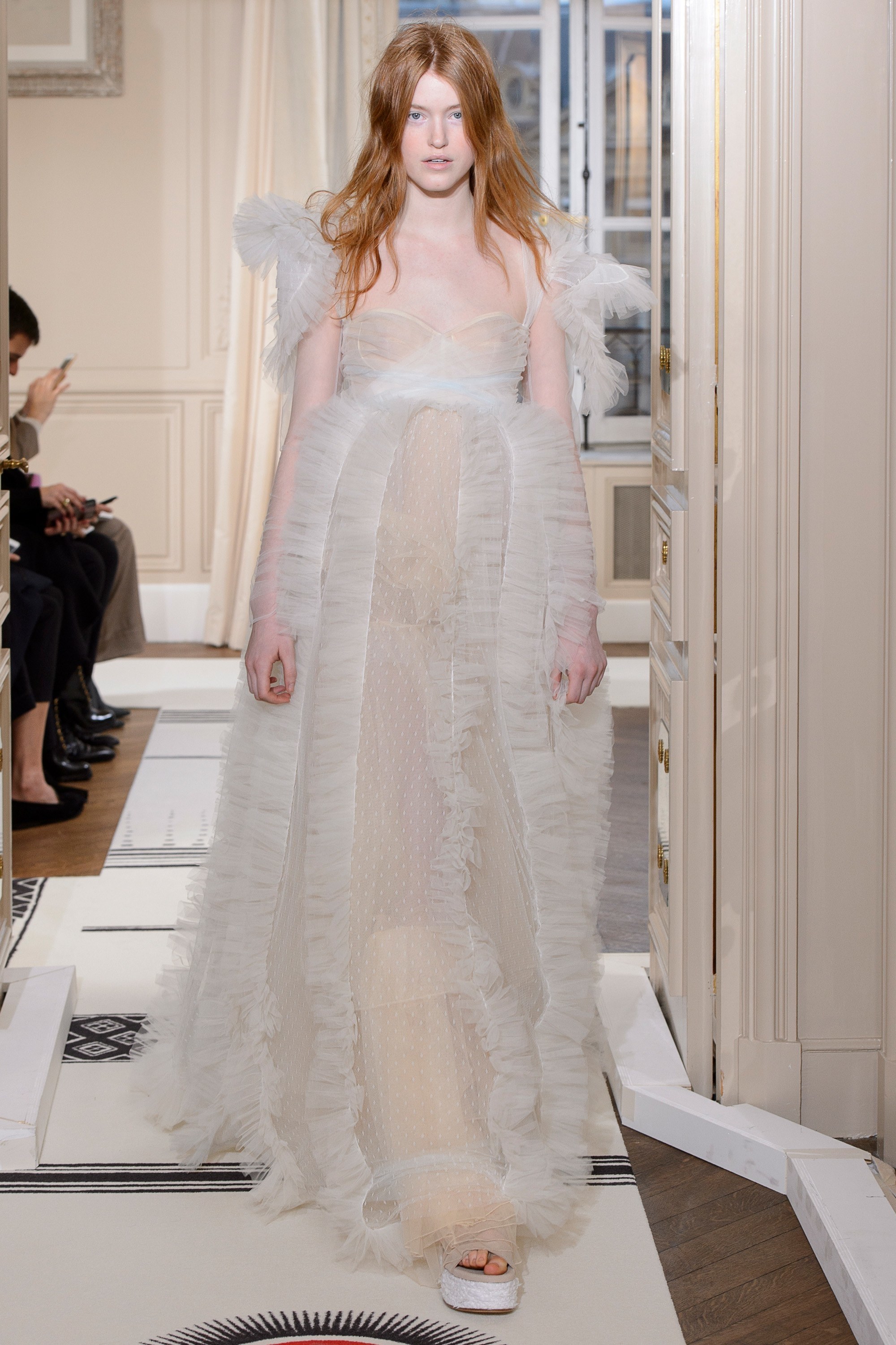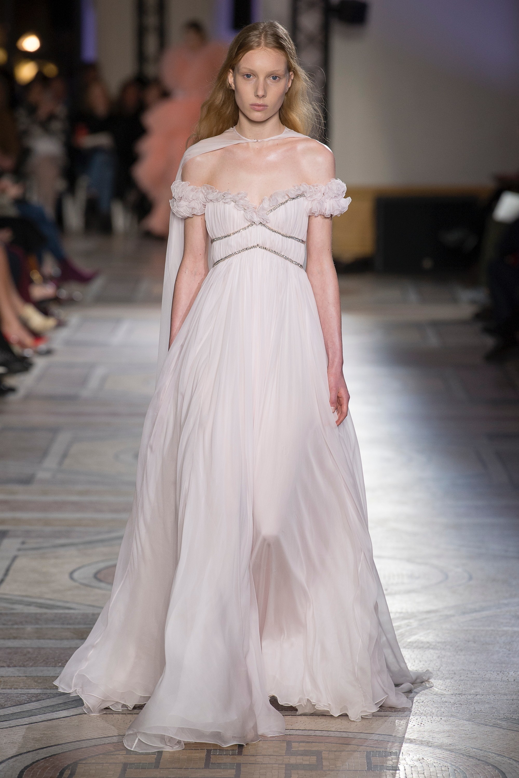 Không thể không nhắc đến chiếc váy với gam màu hồng nhẹ nhàng của nhà mốt Giambattista Valli. Tuy không có màu trắng truyền thống nhưng với phần vai trễ nhẹ nhàng, cùng phần cúp chữ V trễ nải, thiết kế dễ dàng làm xiêu lòng bất cứ cô dâu nào trong ngày cưới của họ.