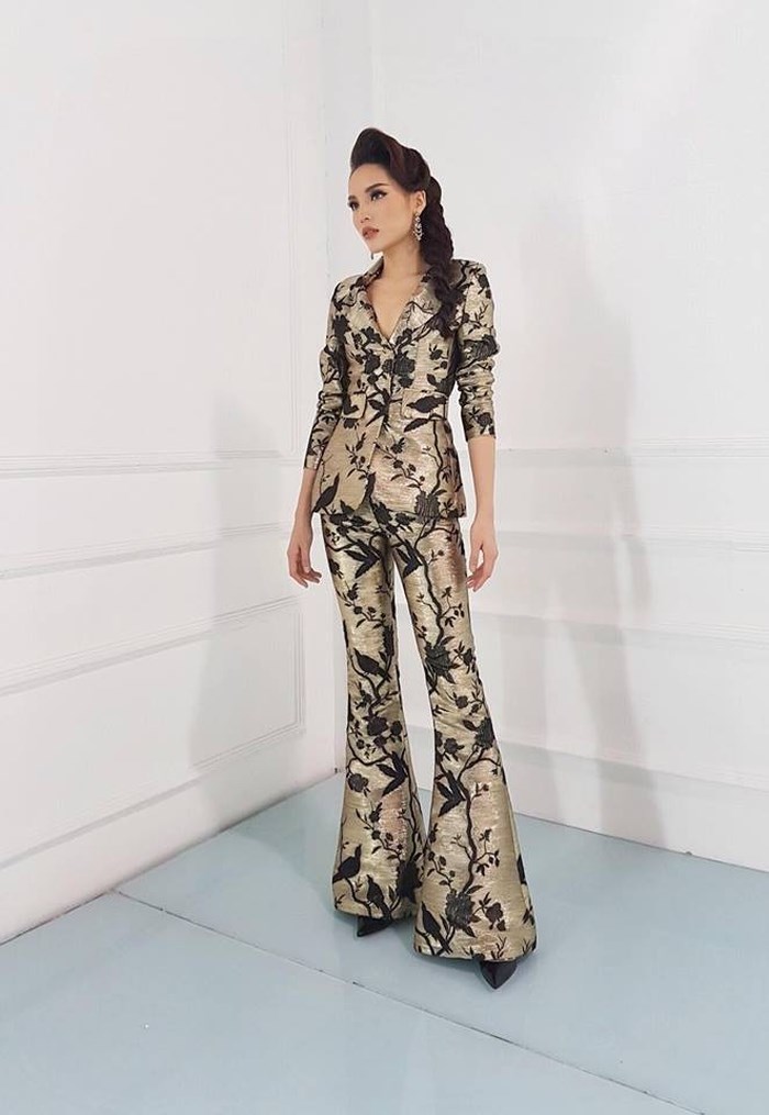Những bộ cánh mà Kỳ Duyên diện trong chương trình là những thiết kế của các nhà mốt đình đám và tất nhiên rất đắt đỏ. Một Kỳ Duyên đầy sắc sảo và quyền lực trong bộ suit ống loe họa tiết trên nền ánh vàng sang trọng.