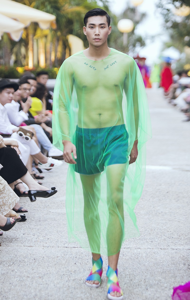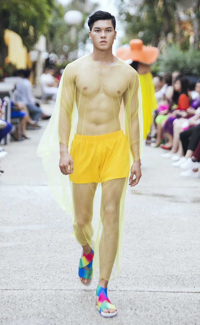 Tuy nhiên, ở bộ sưu tập này, các người mẫu nam lại một lần nữa trở thành tâm điểm khuấy động sàn diễn với trang phục màu sắc rực rỡ cùng những mẫu đồ bơi kết hợp áo choàng lưới mỏng tanh bên ngoài tạo nên nét chấm phá độc đáo cho show diễn.