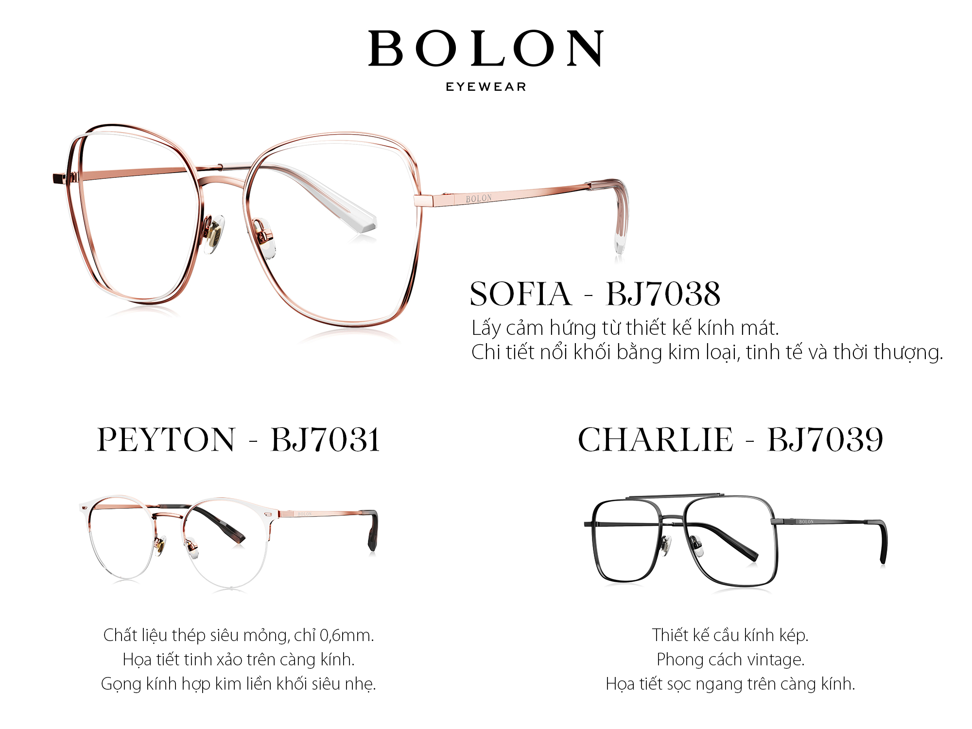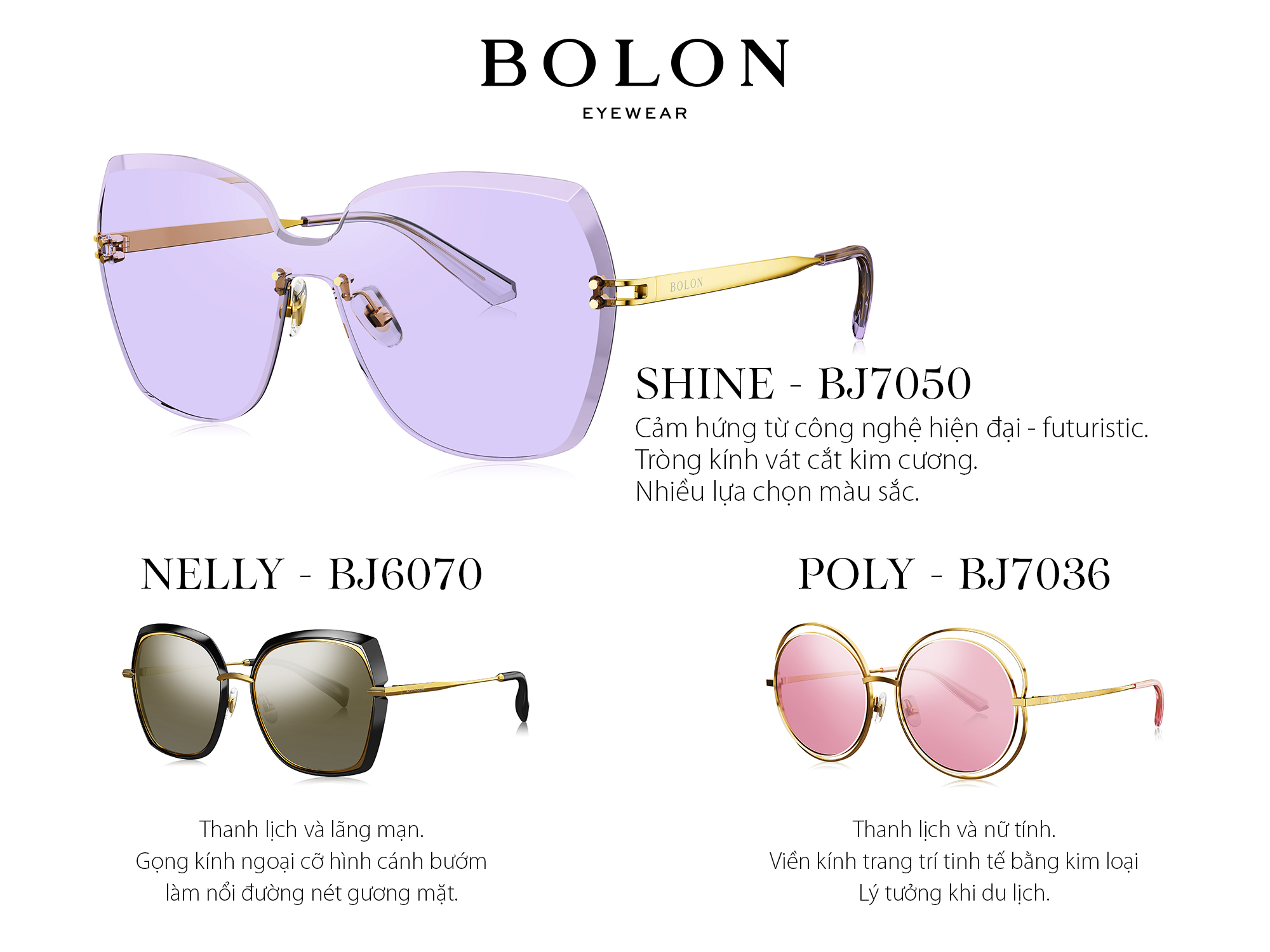 Bolon Eyewear quay trở lại với những thiết kế kính mát thời thượng, sang trọng dành cho phái nữ. Mắt bản lớn, viền kính cách điệu và sự đa dạng về hình khối là những điểm nhấn chủ đạo.