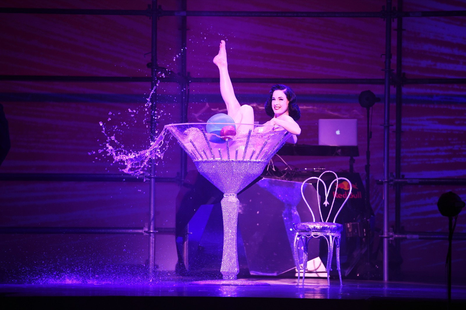 Dita Von Teese biểu diễn trên sân khấu tại show thời trang Philipp Plein trong Tuần lễ thời trang New York