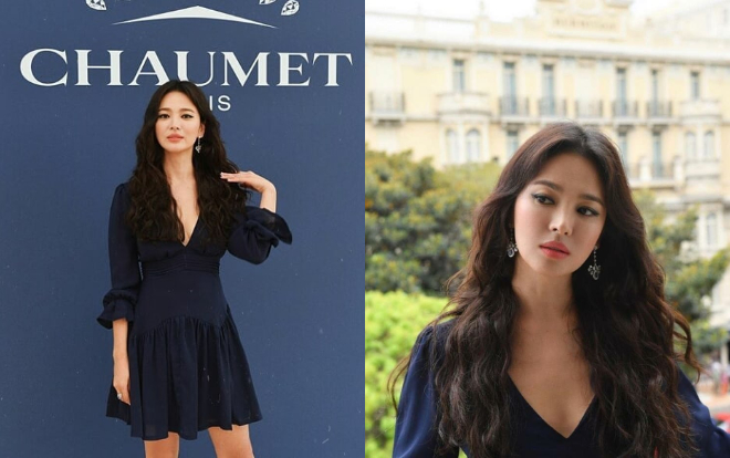 Trước đó, Song Hye Kyo cũng nhanh chóng update hình ảnh mình với bộ váy ngắn tay dài xẻ ngực sâu màu xanh đen đầy nổi bật