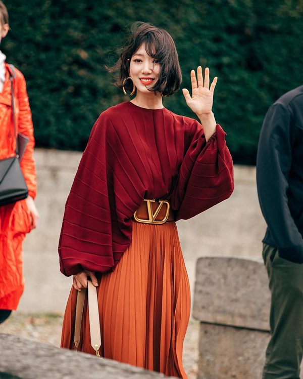 Set đồ áo cánh dơi và chân váy xếp ly dài, cô nàng còn kết hợp thắt lưng, khuyên tai và túi xách đồng điệu đi kèm khiến tổng thể vô cùng nổi bật, ai ai cũng phải ngoái nhìn