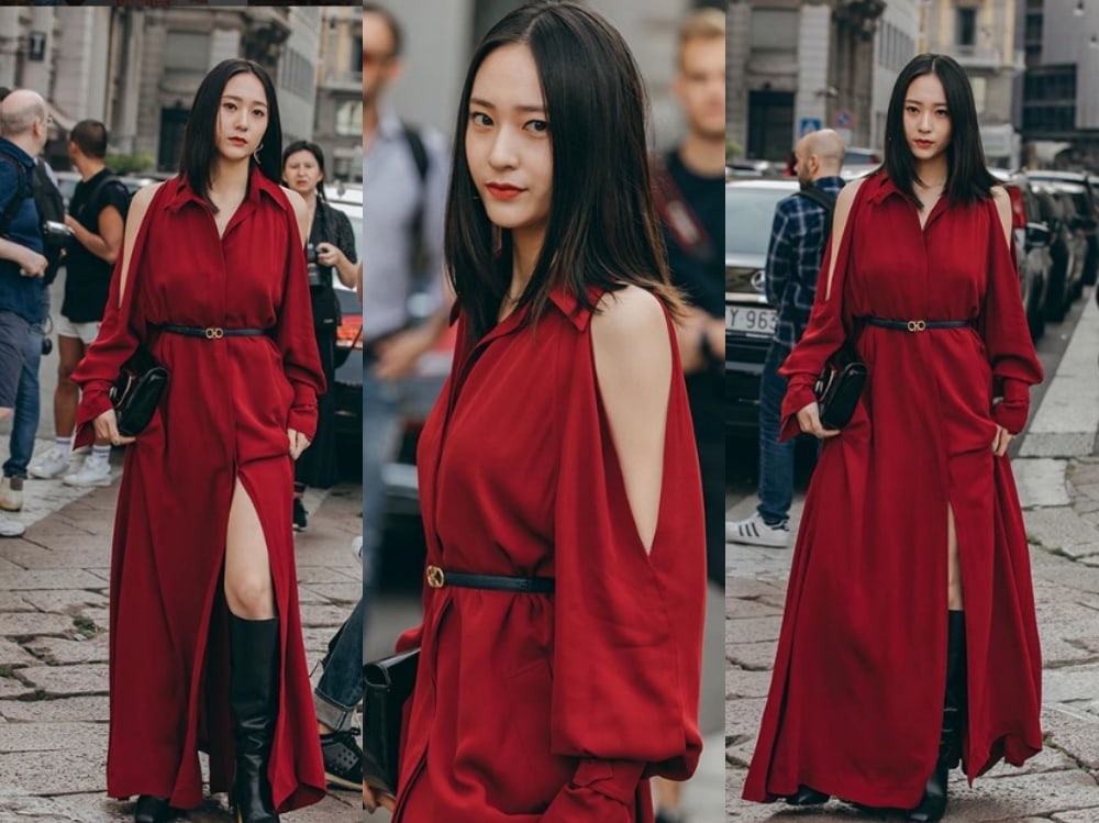 Hai chị em nhà Jung đều có đam mê mãnh liệt với thời trang và các ông lớn trong nghề cũng rất ưu ái gửi thiệp mời đều như vắt chanh cho 2 nàng. Krystal chưa bao giờ gây thất vọng khi tham dự các show thời trang cả. Ngoại hình thanh lịch, sang trọng của Krystal dù ở Hàn hay ở Châu Âu thì cũng nổi bật như nhau. Váy đỏ dài chấm gót chân cùng boot da, sự kết hợp khác lạ đến kỳ quặc này đúng là chỉ Krystal mới cân được.