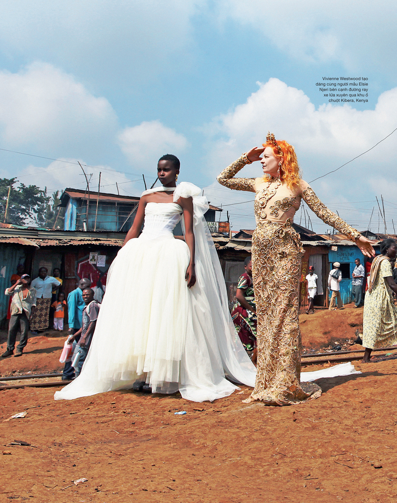 Một trong những shoot chụp hình thời trang độc đáo của bà. Vivienne Westwood tạo dáng cùng người mẫu Elsie Njeri bên cạnh đường ray xe lửa xuyên qua khu ổ chuột Kibera, Kenya