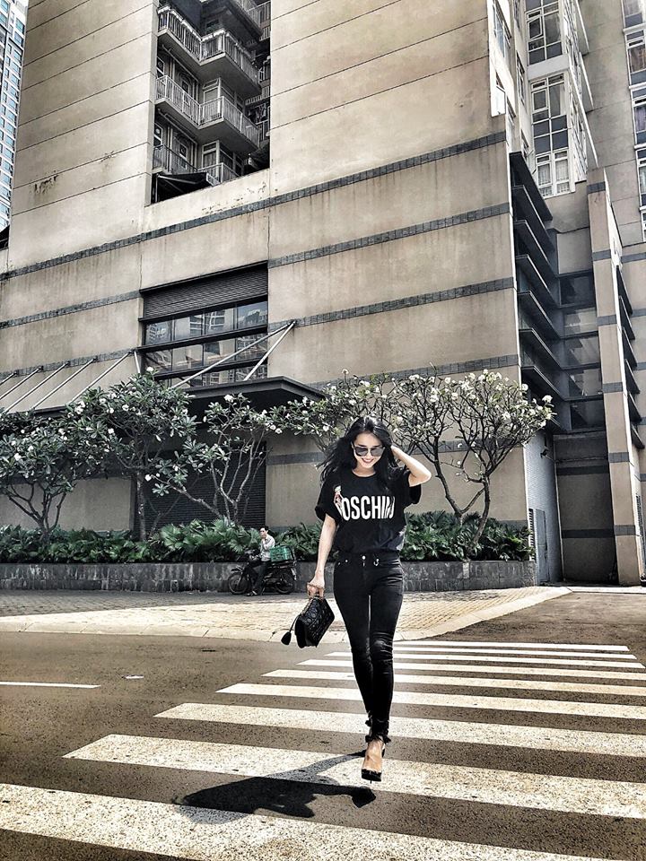 Trong một set đồ khác, Tóc Tiên vẫn trung thành với phụ kiện đen từ kính mắt, clutch tới boot.