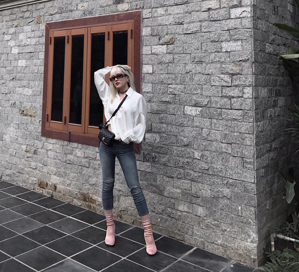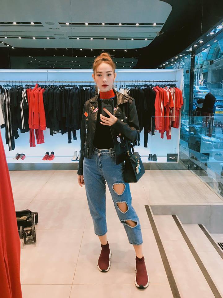 Trong bức hình mới nhất, Minh Hằng cũng đeo túi Hermes đắt đỏ kết hợp với đôi boot Balenciaga đỏ mận. Outfit cá tính này khác với những hình ảnh Minh Hằng trong các bộ váy điệu đà như thường lệ.