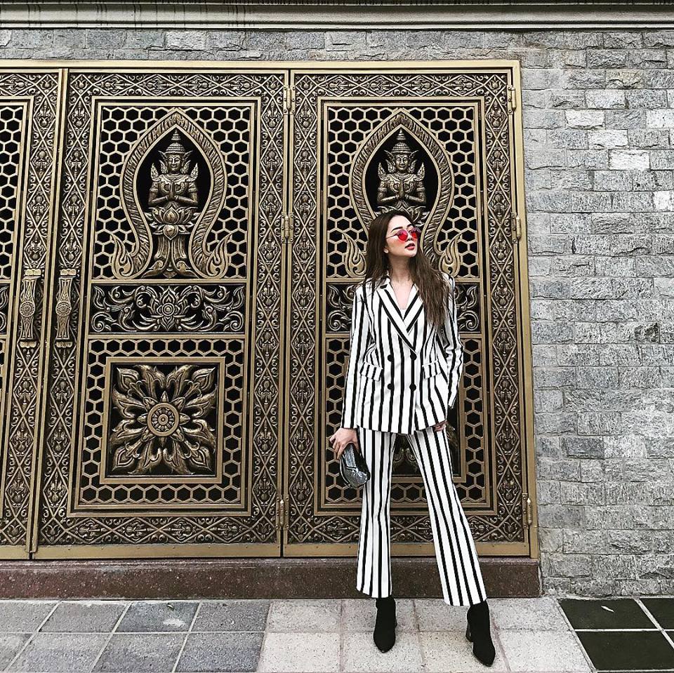 Đầu năm mới không quên “nhiệm vụ” mặc đẹp, Thiều Bảo Trang diện bộ suit kẻ sọc đen trắng, kết hợp boot và clutch ánh kim cực bắt mắt.