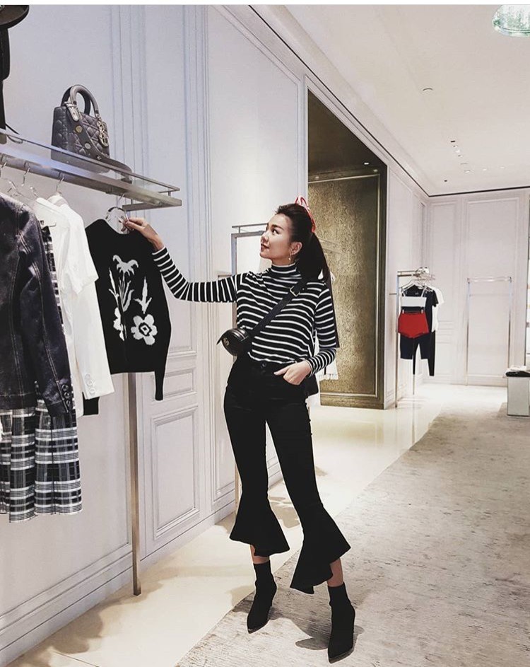 Thanh Hằng với phong cách menswear như thường lệ sử dựng belt bag Gucci và boot liền tất cùng tông đen. Chiếc quần ống chuông là điểm nhấn cho set đồ của siêu mẫu thêm hoàn hảo.