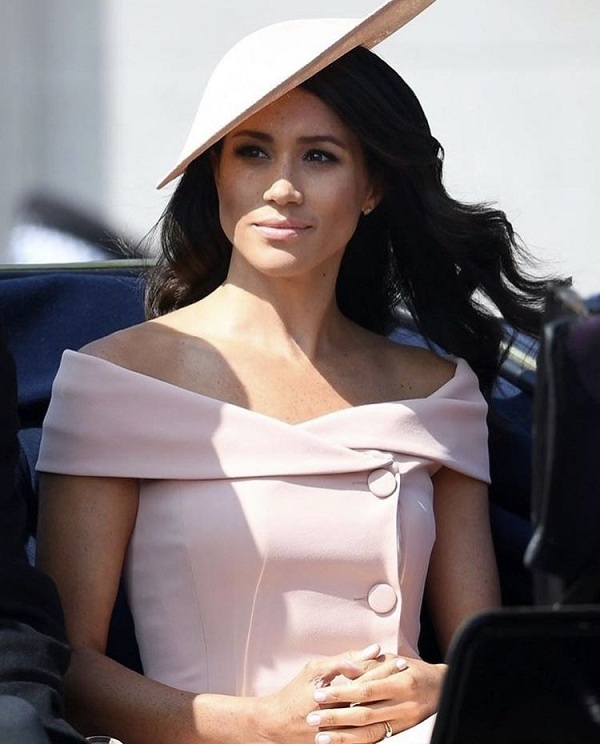 Meghan Markle tại lễ Trooping The Color năm 2018 khi diện mẫu váy trễ vai màu hồng phấn khoe xương quai xanh. Đây vốn là sự kiện vô cùng trang trọng nên trang phục của Meghan bị đánh giá là gợi cảm quá đà không phù hợp