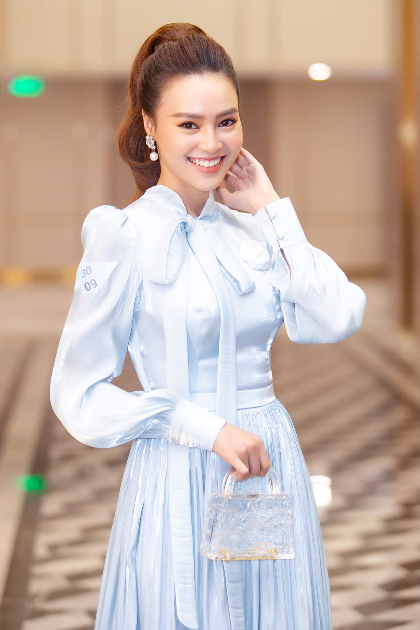 Chiếc nơ ngay cổ cùng túi xách trong veo được nhận định là cực kỳ phù hợp khi đi cùng nhau.