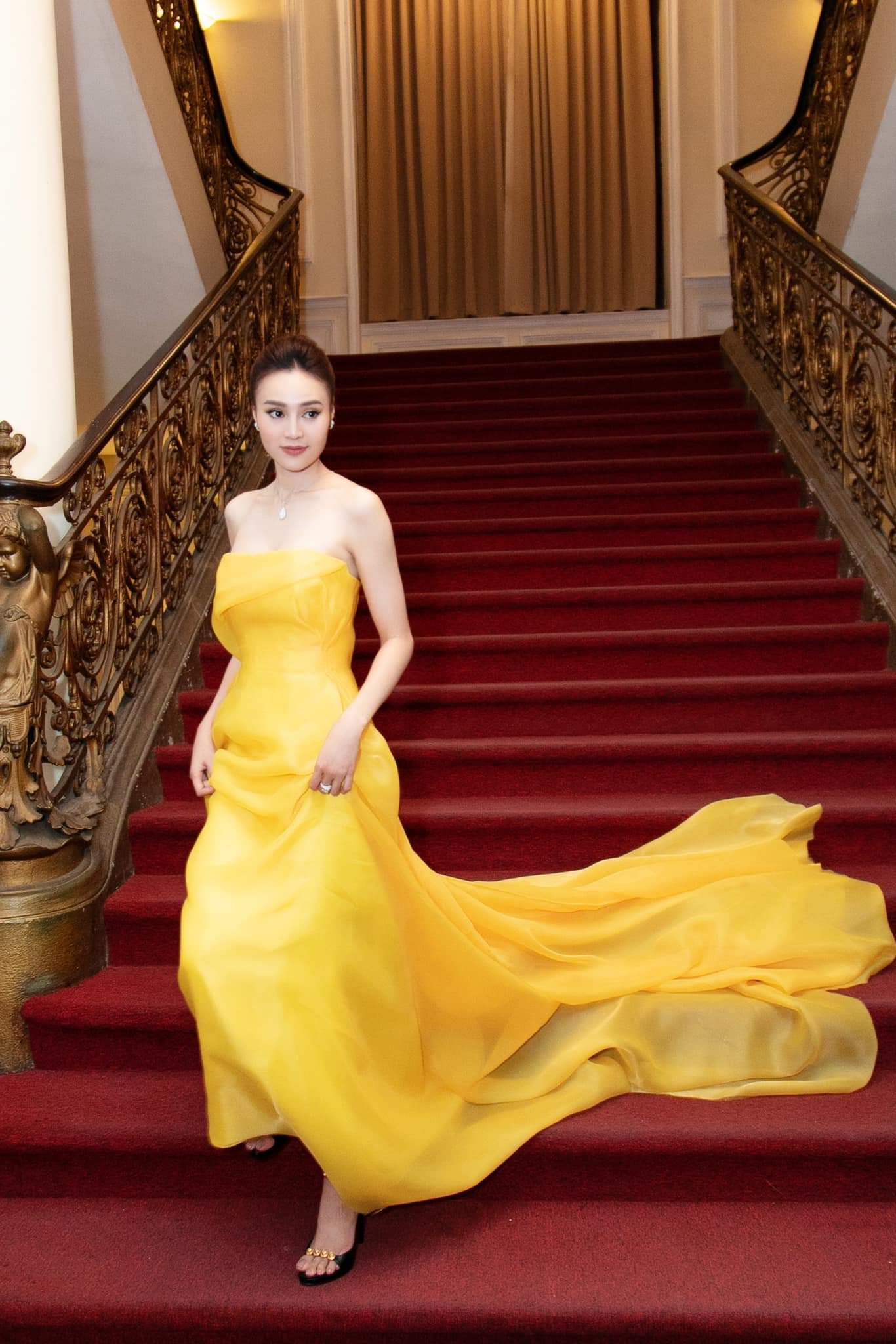 Chiếc váy vàng cúp ngực với phần tà dài tạo thành hình ảnh nàng Lọ Lem đang chạy đến buổi dạ vũ của đời mình.