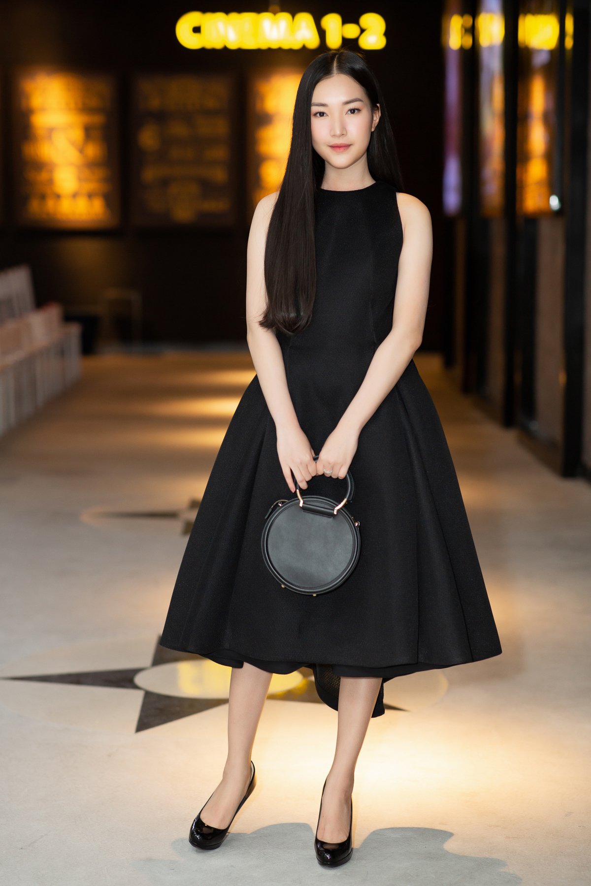 Người mẫu Quỳnh Châu khoe dáng trong chiếc váy nhung đen, thắt nơ phần ngực.