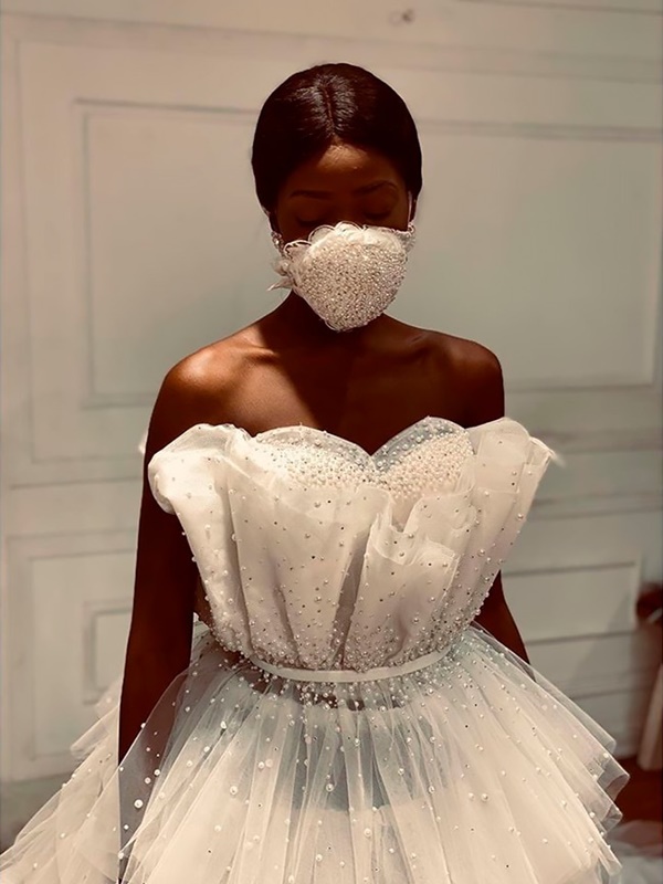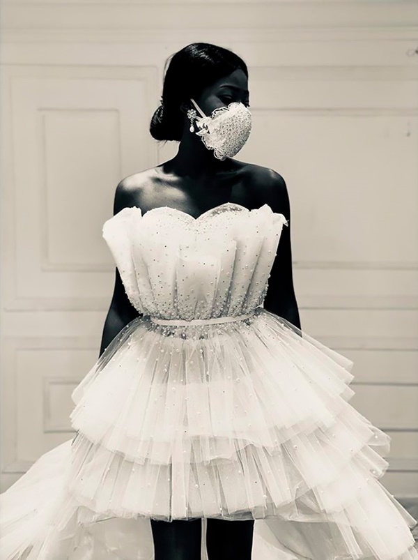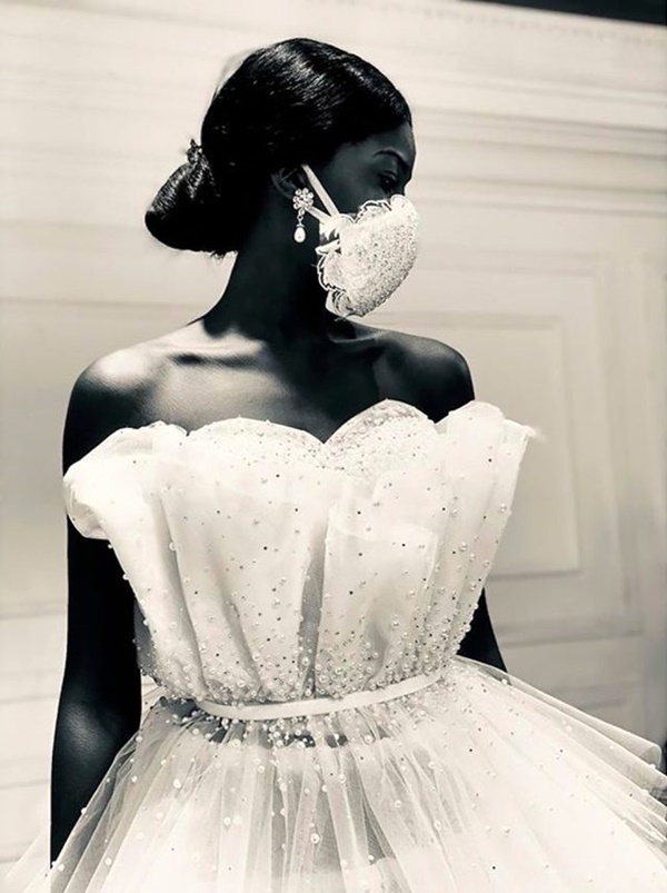 Item khẩu trang được thiết kế cực kỳ long lanh sao cho phù hợp với mẫu váy cưới, từ chất liệu đến những phụ kiện đính kết.