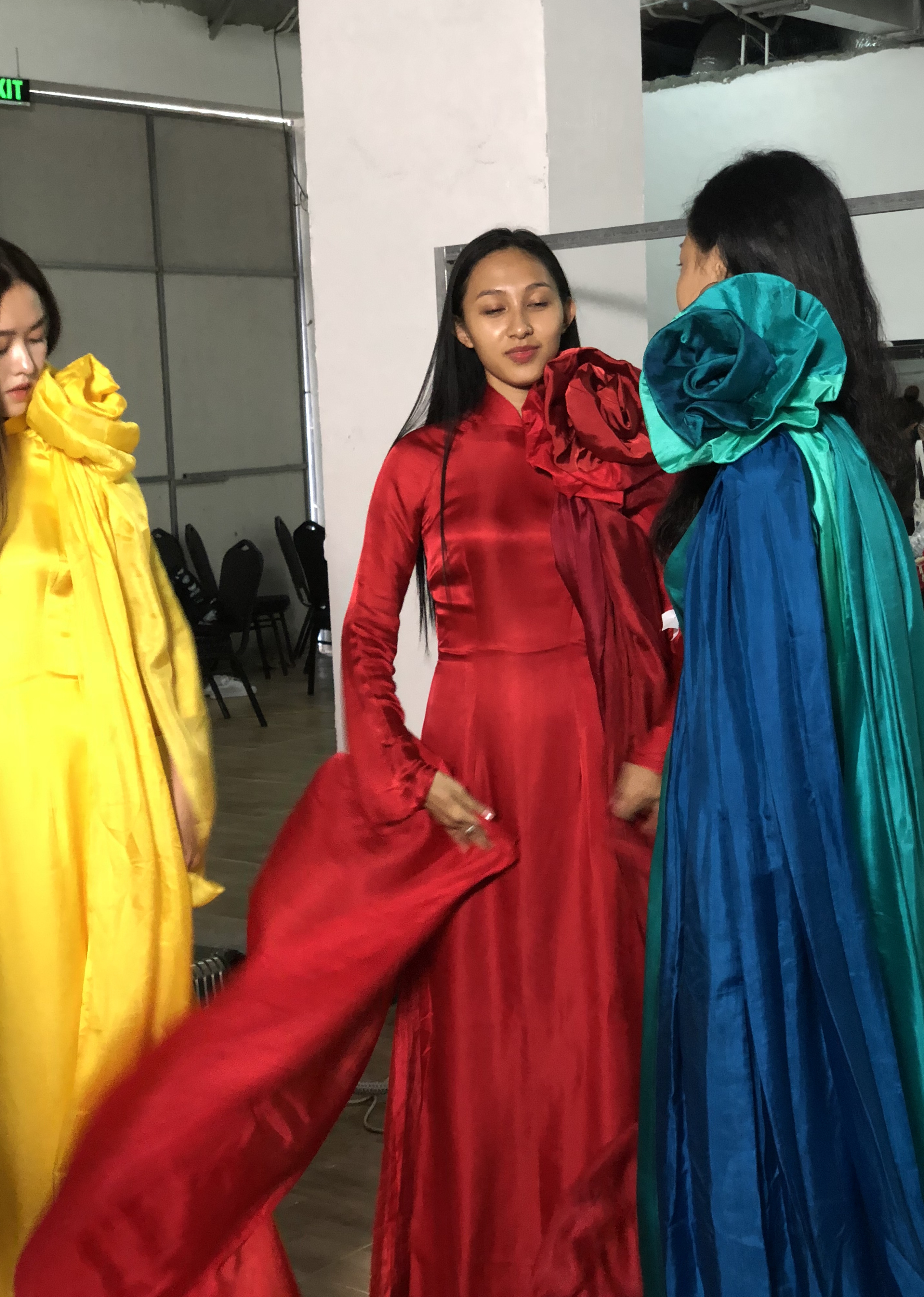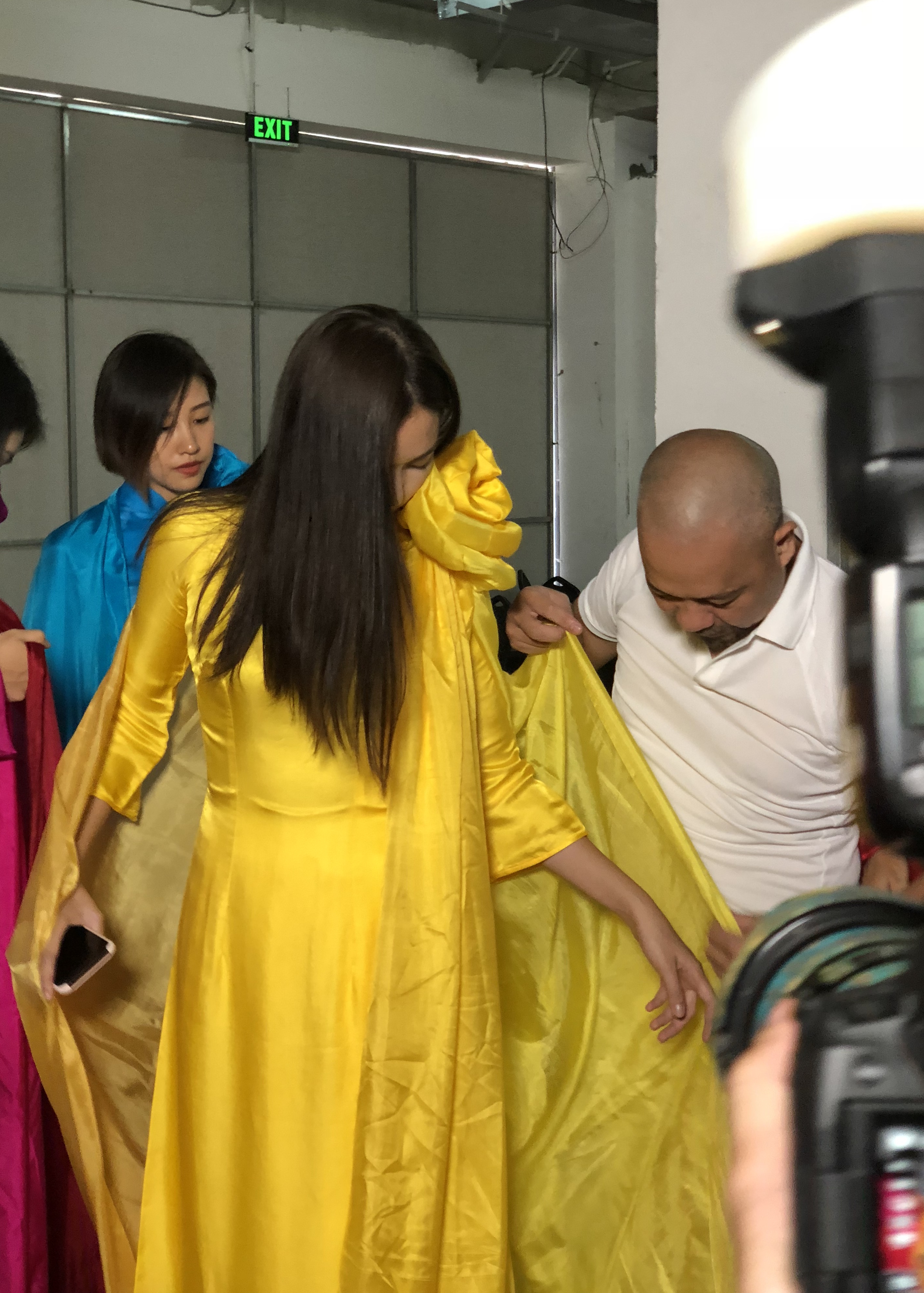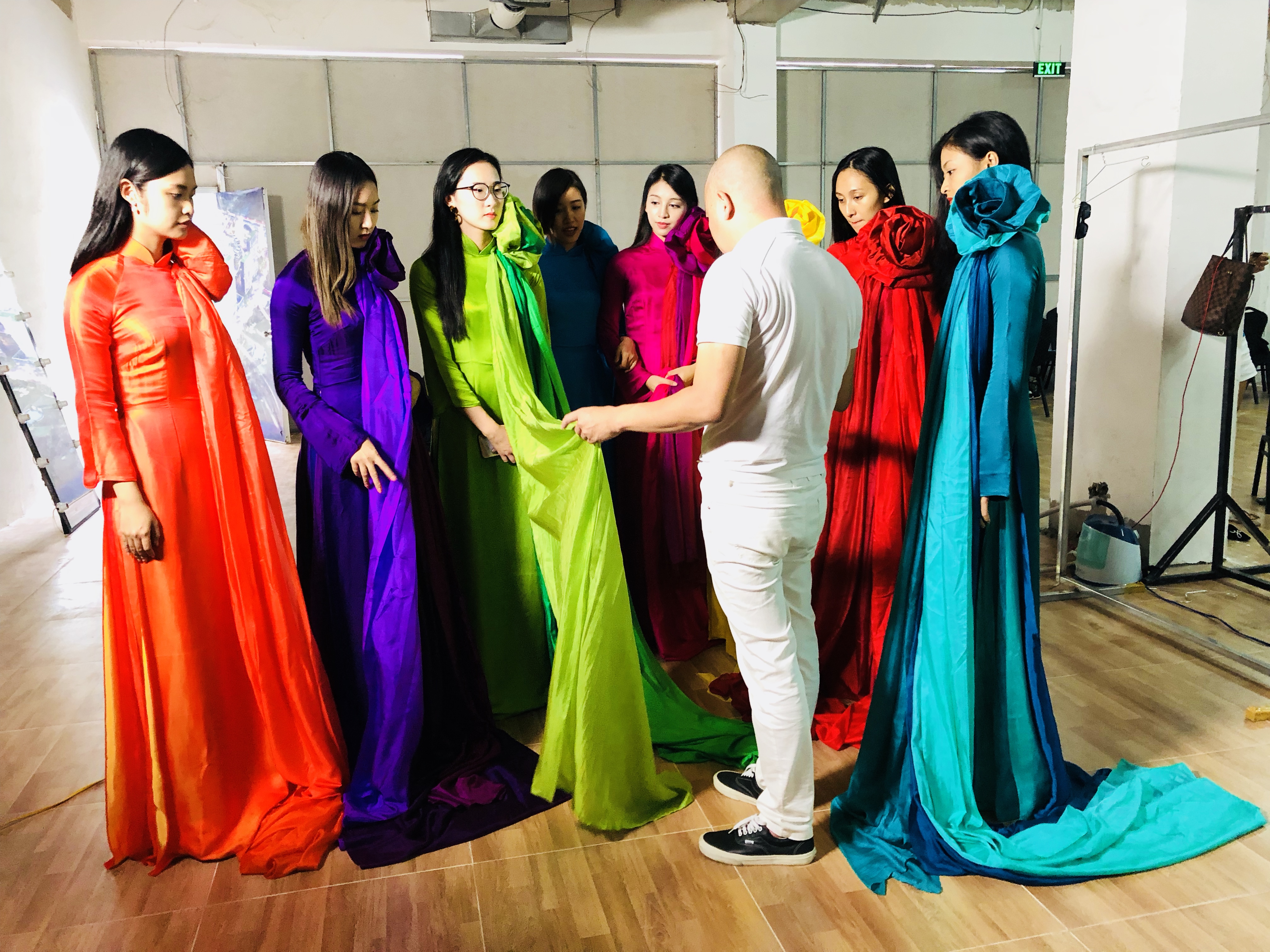 Trước giờ G, anh chăm chút, cẩn thận từng tí, chỉnh sửa, ướm trang phục cho các chân dài để phần trình diễn được hoàn hảo nhất.