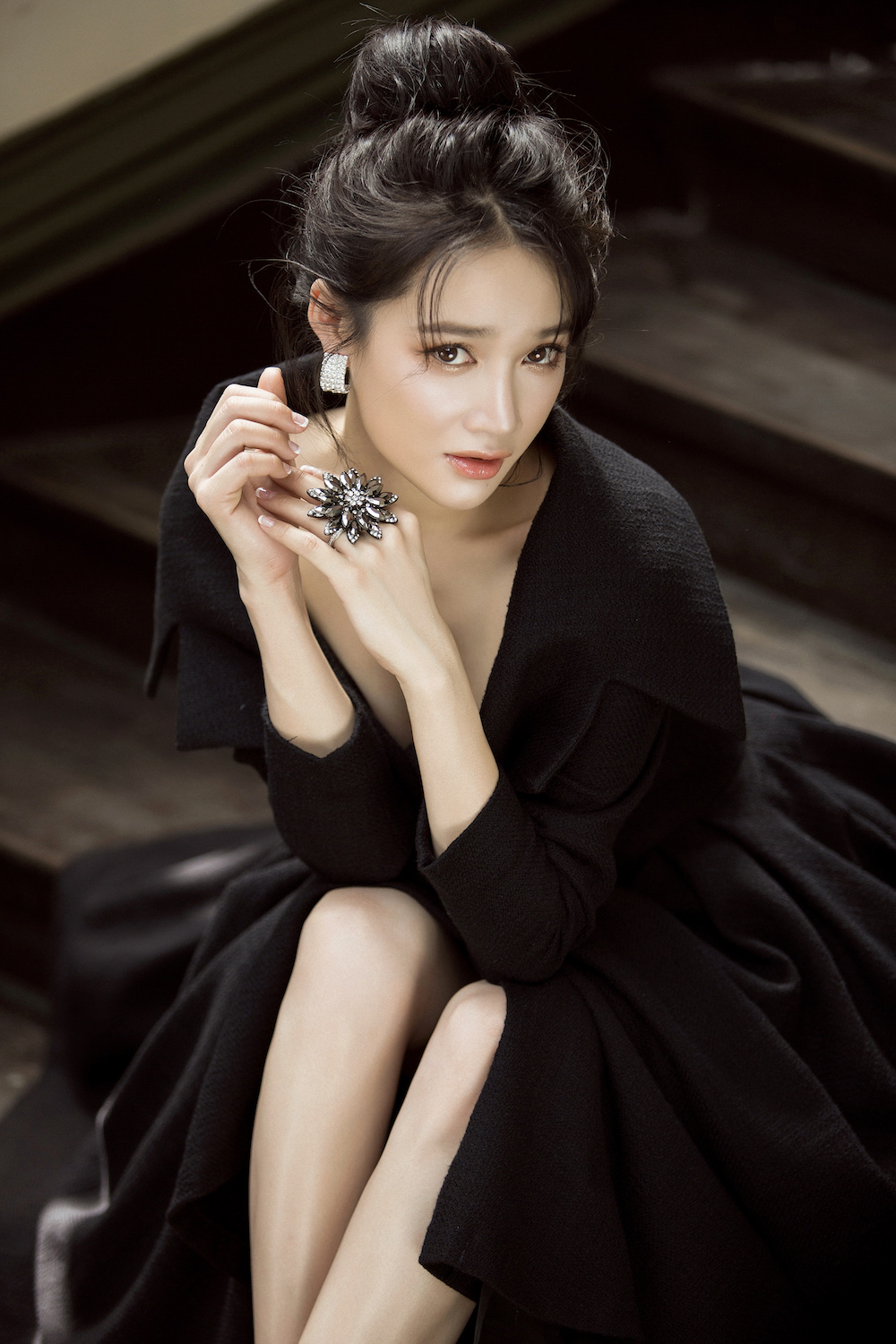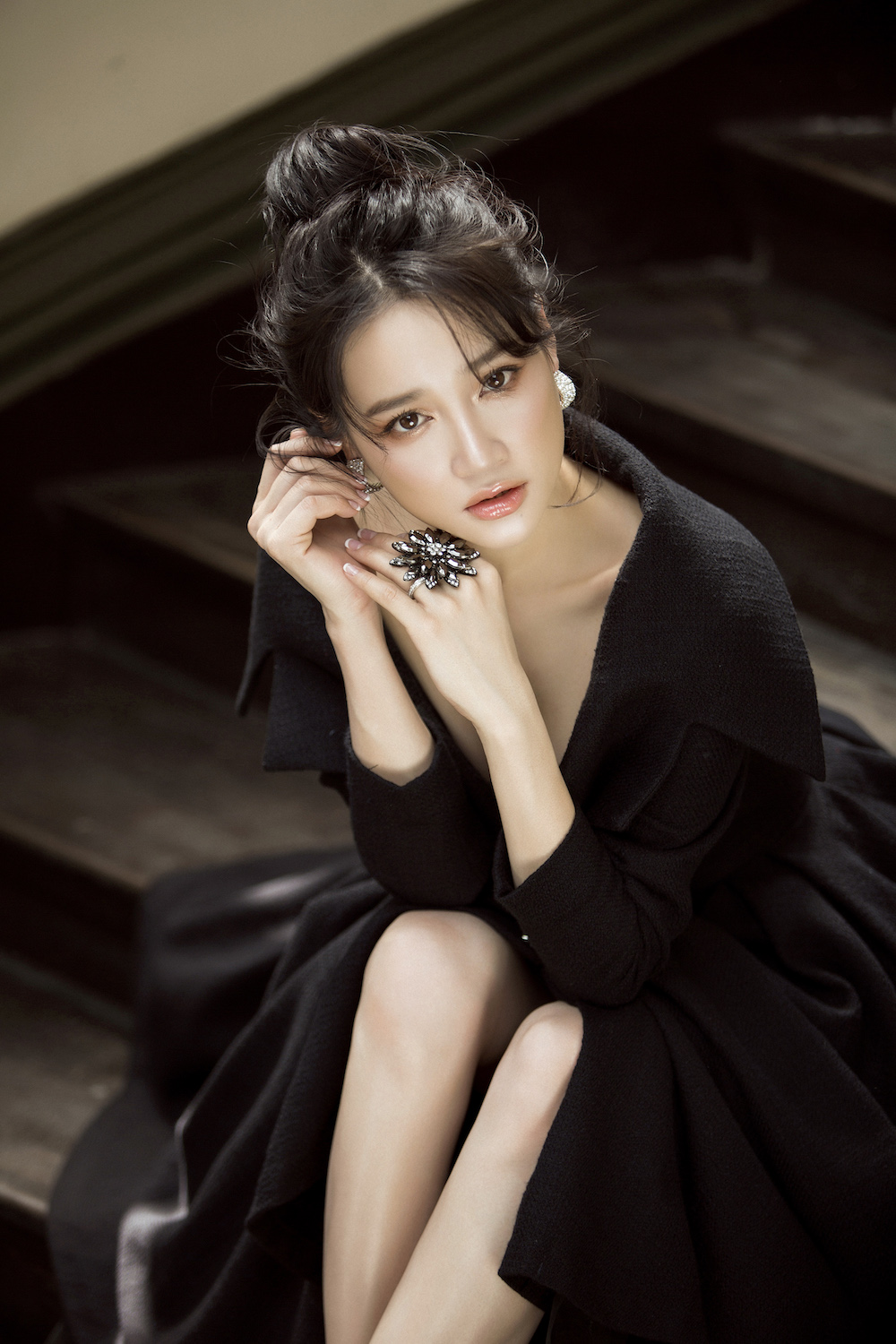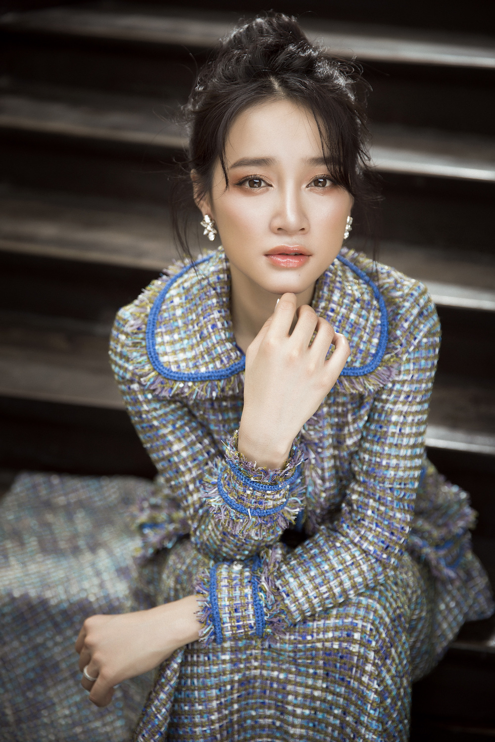 Mái tóc búi cũng giúp bà xã danh hài khoe khéo chiếc cổ cao thon gọn cùng làn da trắng ngần.