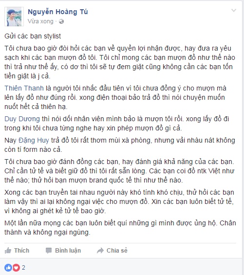 Một lần nữa mong các bạn luôn biết quí những gì mình được ủng hộ. . Còn rất nhiều stylist rất tử tế, các bạn đừng làm những người khác có ác cảm về nghề này. Chân thành và không ngại ngùng”.