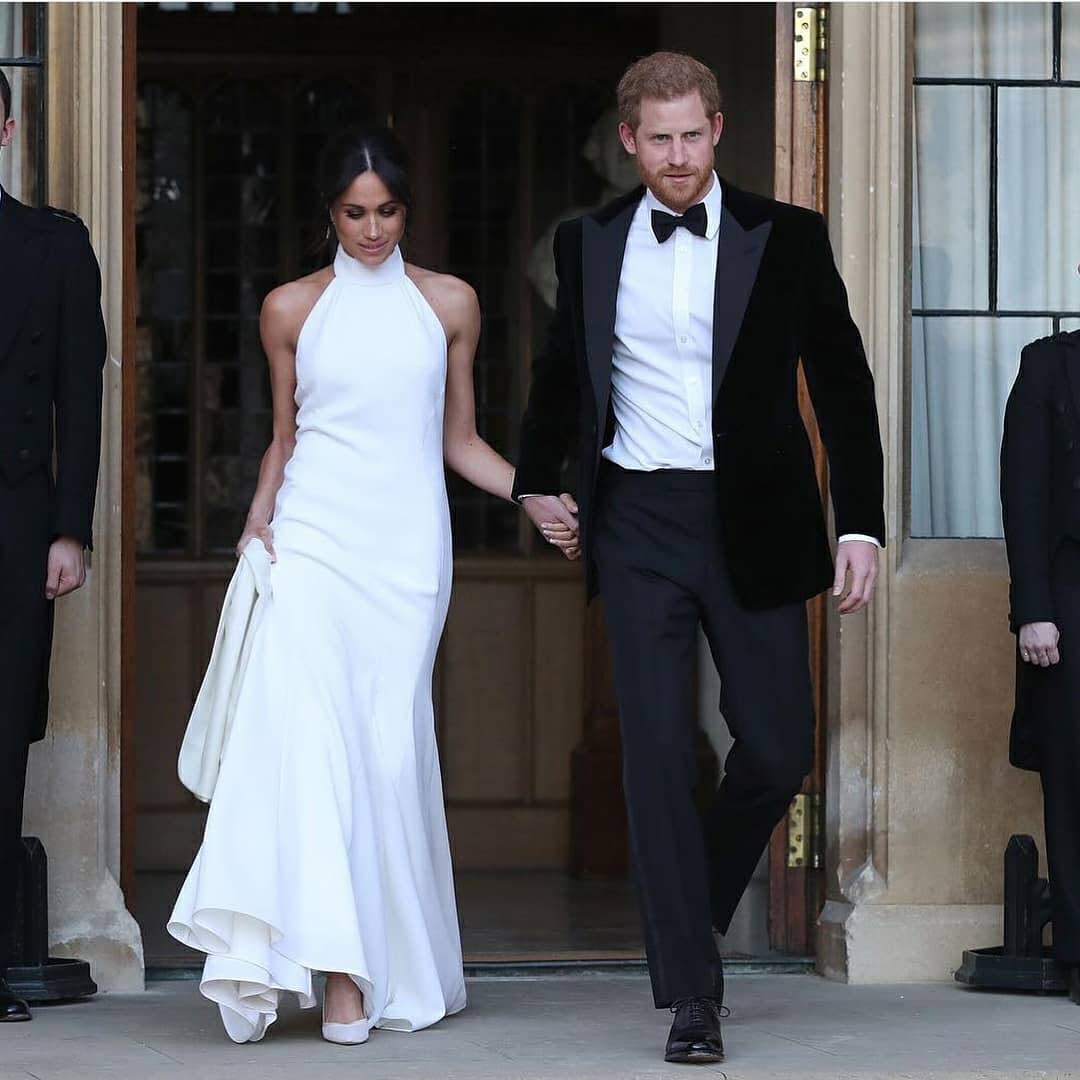 Váy cưới của Meghan Markle có thiết kế đầm lụa trắng đơn giản, cổ cao tinh tế và khoe trọn bờ vai đầy gợi cảm.
