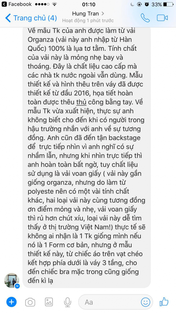 “Về mẫu thiết kế của anh được làm từ vài Organza (vải này anh nhập từ Hàn Quốc) 100% là lụa tơ tằm. Tính chất của vải này mỏng nhẹ bay và thoáng. Đây là chất liệu cao cấp mà mà các nhà thiết kế nước ngoài vẫn dùng. Mẫu thiết kế và hình thêu trên váy đã được thiết kế từ đầu năm 2016, họa tiết hoàn toàn được thêu thủ công bằng tay. Về mẫu thiết kế vừa xuất hiện, thực sự anh không biết cho đến khi có người trong hậu trường nhắn với anh về sự tương đồng. Anh cũng đến tận backstage để trực tiếp nhìn vì anh nghĩ có sự nhầm lẫn, nhưng khi nhìn trực tiếp thì anh hoàn toàn bất ngờ, tuy chất liệu sử dụng là loại voan giấy (vải này gần giống organza, nhưng do làm từ polyeste nên có một vài tính chất khác, hai loại vải này tương đồng ở điểm mỏng và nhẹ, vải voan giấy thì rủ hơn chút xíu, loại vải dễ tìm thấy ở thị trường Việt Nam. Thực tế sẽ không ai nhận là một thiết kế giống mình nếu nó là 1 form cơ bản, nhưng ở mẫu thiết kế này, từ chiếc áo trên vạt chéo kết hợp phía dưới lá váy 3 tầng, cho đến chiếc bra mặc trong cũng giống đến kì lạ”.