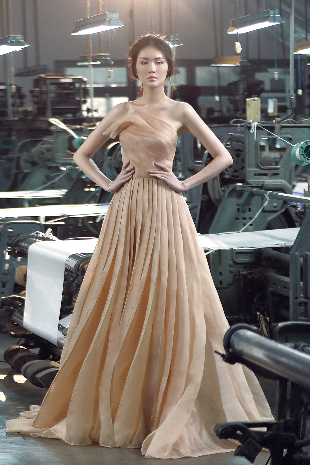 Với chất liệu organza rất dễ nhăn vì được dệt thủ công và khó tạo phom dáng, yêu cầu người thợ may phải vô cùng khéo léo và có tay nghề cao trong kĩ thuật thêu, cắt cúp, tạo rập.