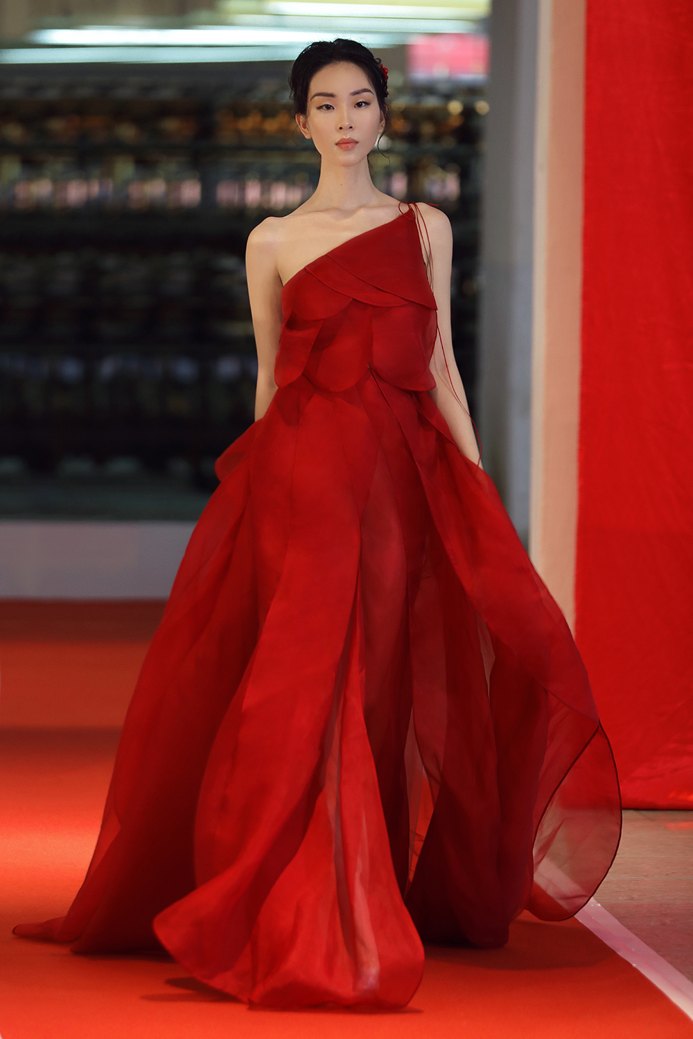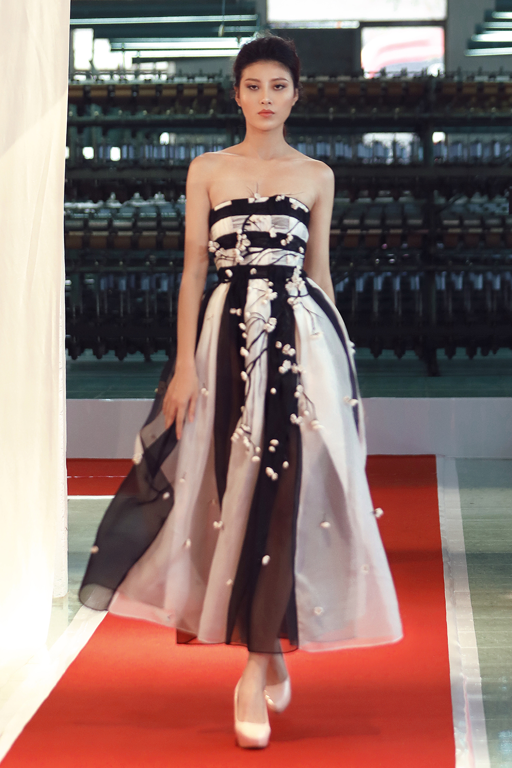 Giống với các BST trước, lần này Trần Hùng tiếp tục thể hiện những thủ pháp thiết kế trên nền vải lụa organza.