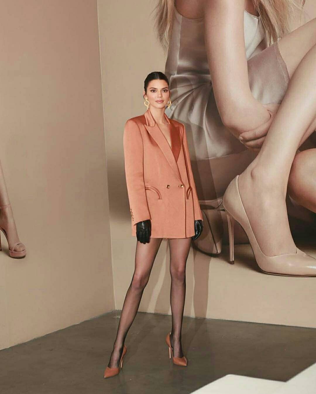 Kendall Jenner vẫn luôn nóng bỏng thu hút người đối diện trong áo khoác blazer dạng váy tông cam đào khoe đôi chân dài miên man “ton sur ton” với giày cao gót nhấn nhá phụ kiện găng tay đen
