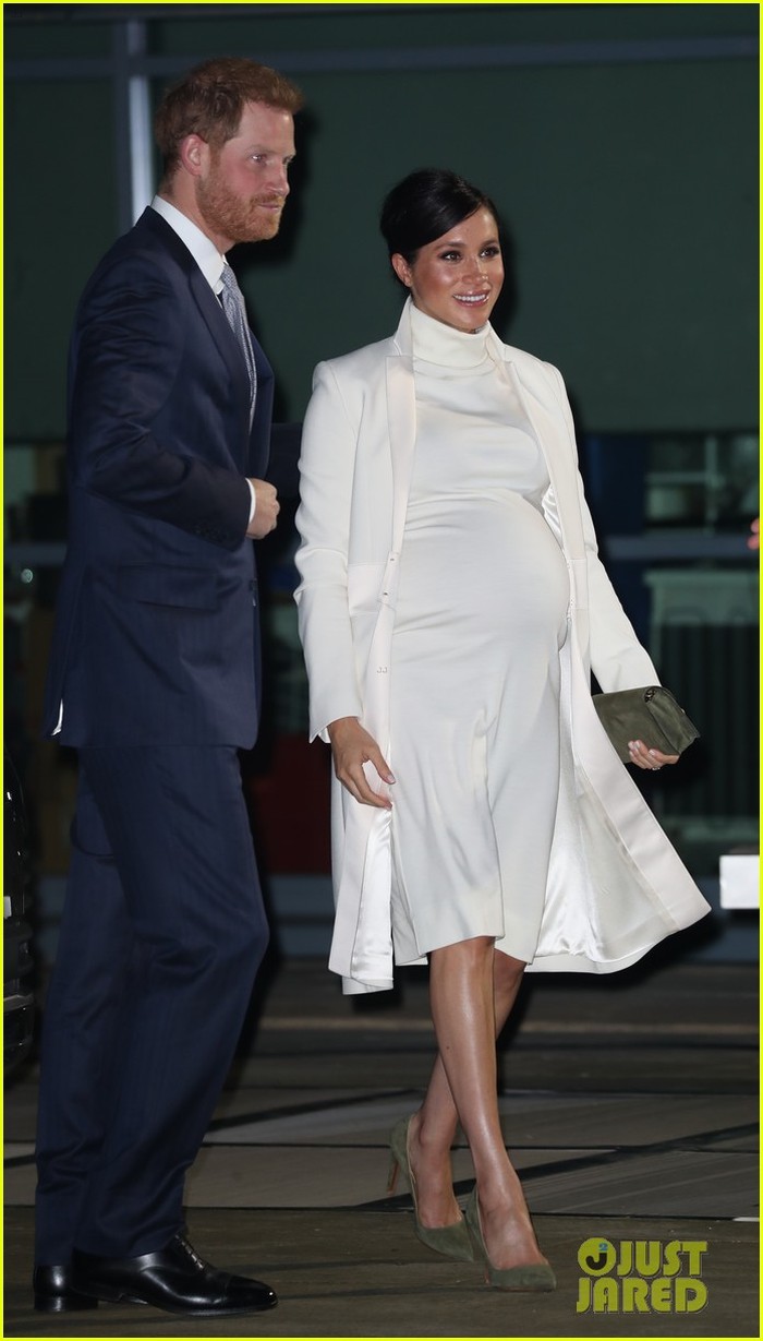 Có thể thấy bụng của cô khá to, nhưng Công nương Meghan vẫn đi giày cao gót sánh vái cùng Hoàng tử Harry