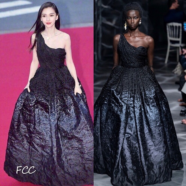 Kiểu váy cô diện đến từ nhà mốt Dior thuộc BST Haute Couture mùa thu 2019 với chất liệu vải lạ mắt, nham nhám không trơn mượt như những chiếc váy khác mà Angelababy từng mặc. Thiết kế này nhìn vậy chứ cực kì kén người mặc nếu như không tiết chế phụ kiện và tông makeup đi kèm