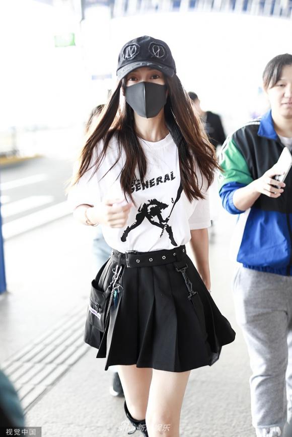 Trước đó tại sân bay Thượng Hải, Angelababy được khen như thiếu nữ 18 tuổi với cây đồ kéo tuổi xuân với áo thun mix cùng váy học sinh xếp ly ngắn