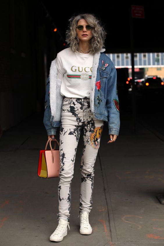 Quý bà chọn áo thun Gucci mix cùng với quần jean wax kèm theo iteam túi xách.