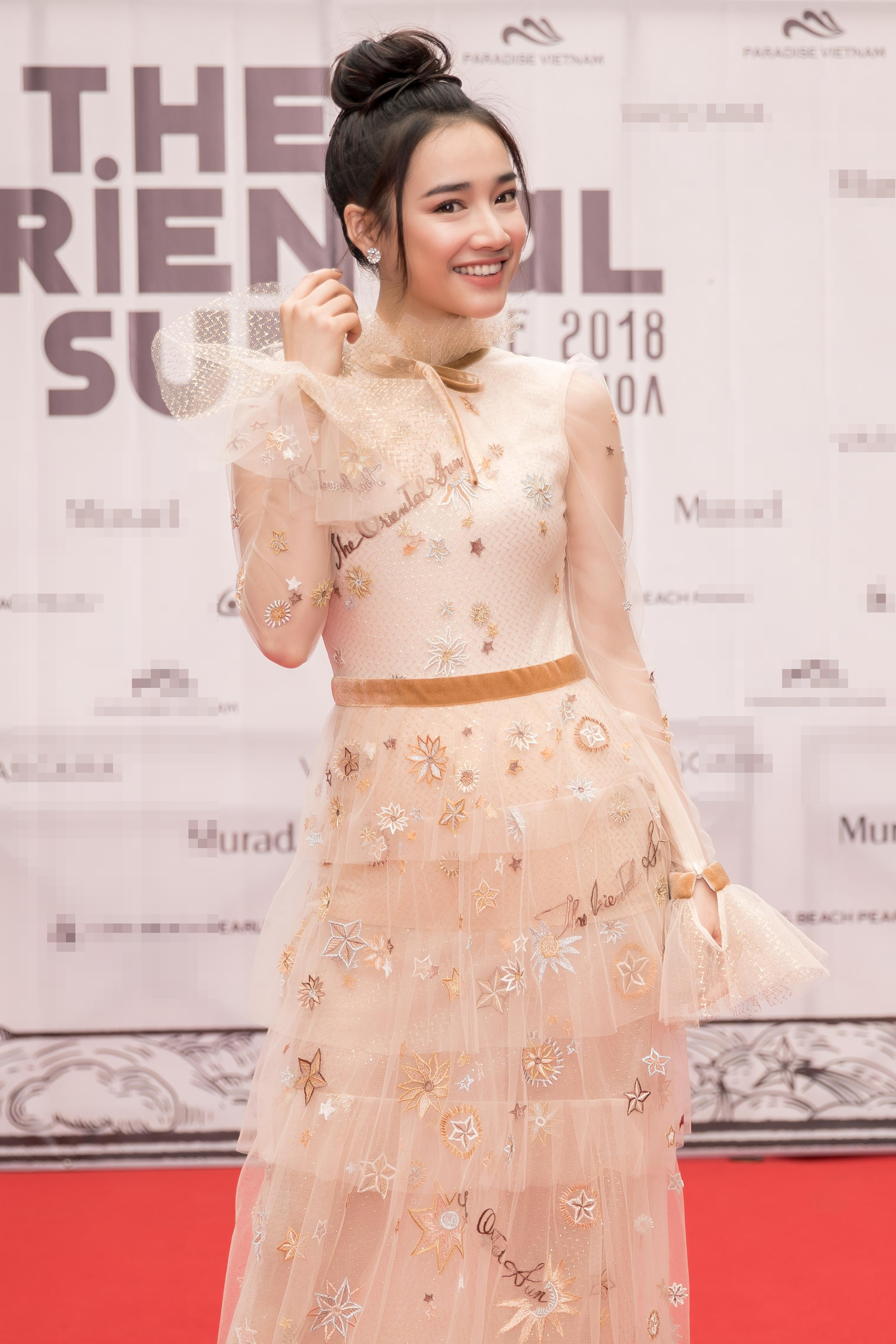 Nữ diễn viên xinh đẹp diện bộ đầm tông màu nude của nhà mốt thân thiết. Trông cô rạng ngời và thu hút nhờ thần thái tươi tắn.