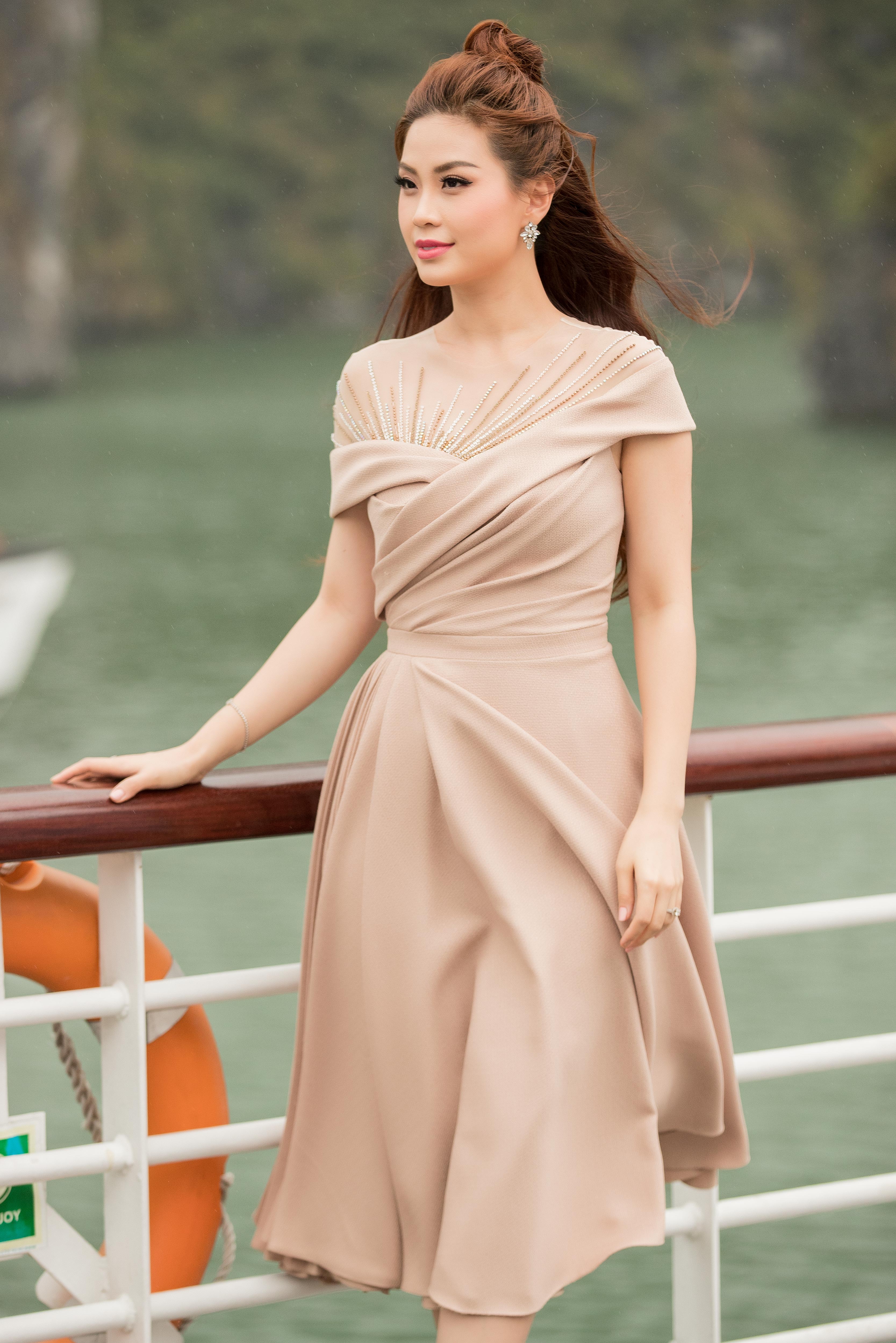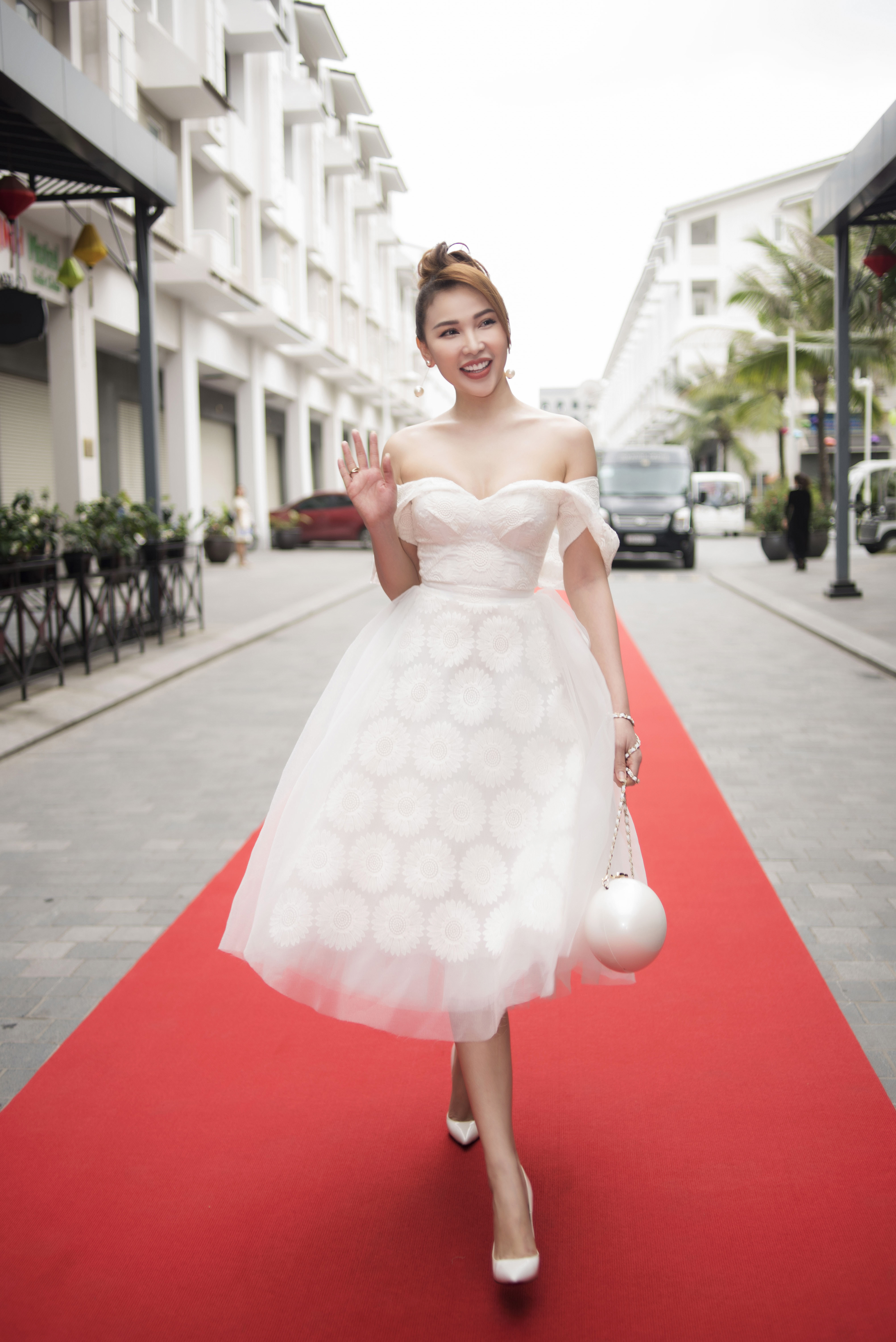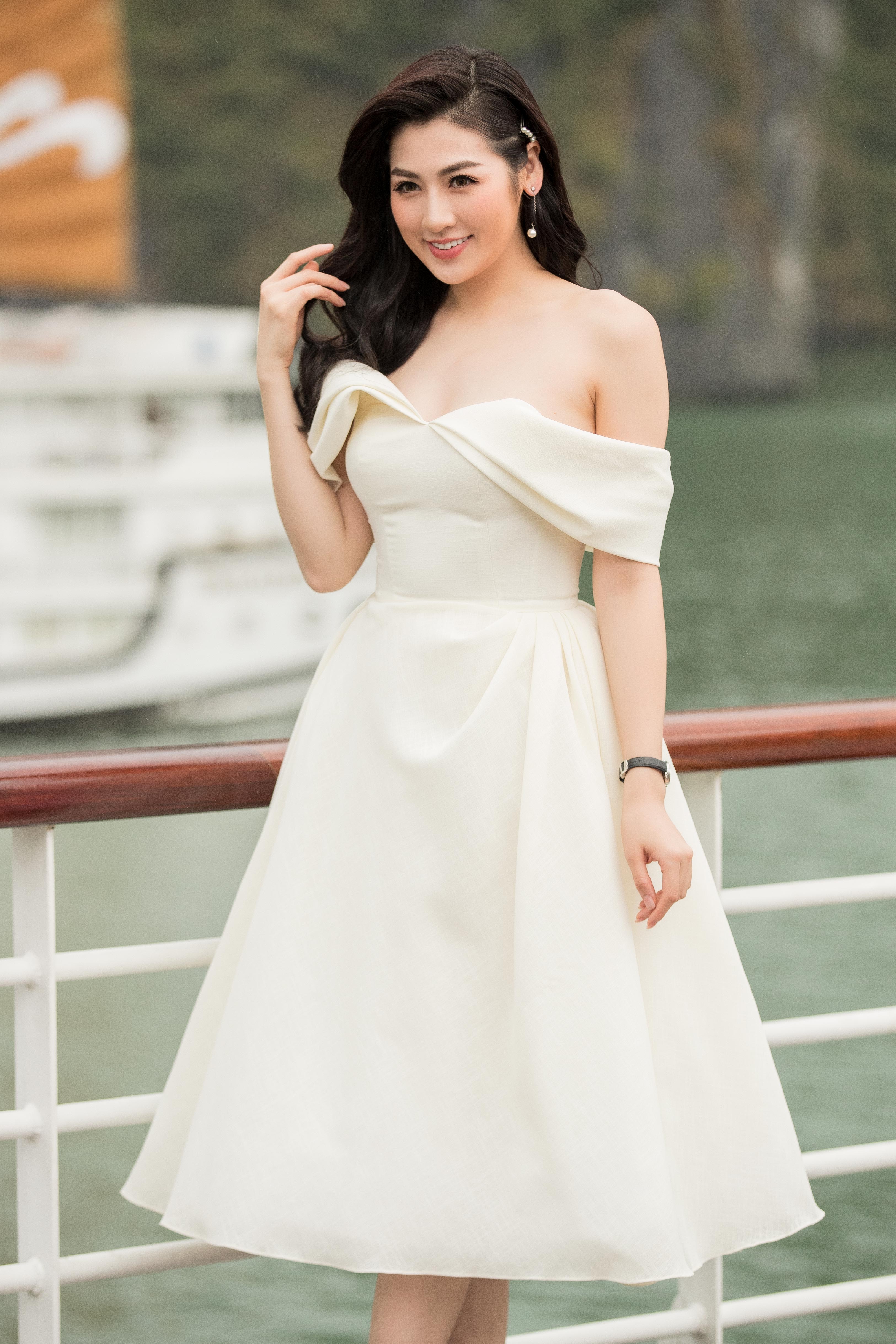 Á hậu Tú Anh khoe vẻ nữ tính trong thiết kế đầm trễ vai.