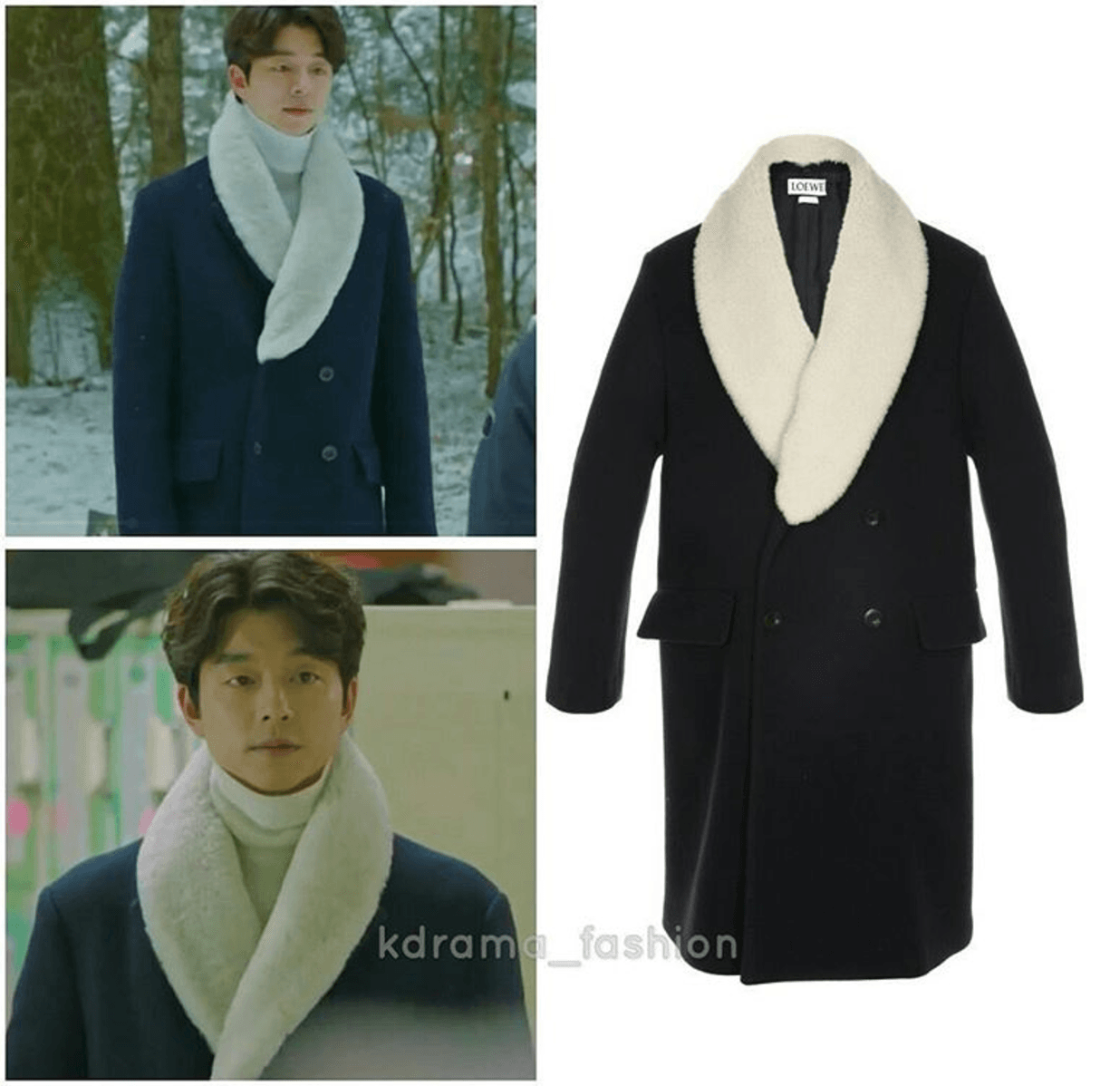 Chiếc áo khoác màu navy với cổ lông ấm áp của Loewe DB cũng nằm ngay ngắn trong tủ đồ của yêu tinh Kim Shin. Nó có giá gần 30 triệu VNĐ.