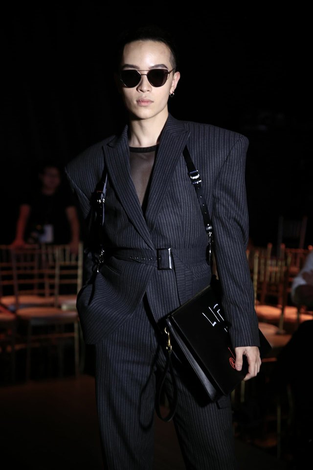 Kelbin diện chiếc kính lạ mắt này với áo độn vai nhìn rất ra chất high fashion.