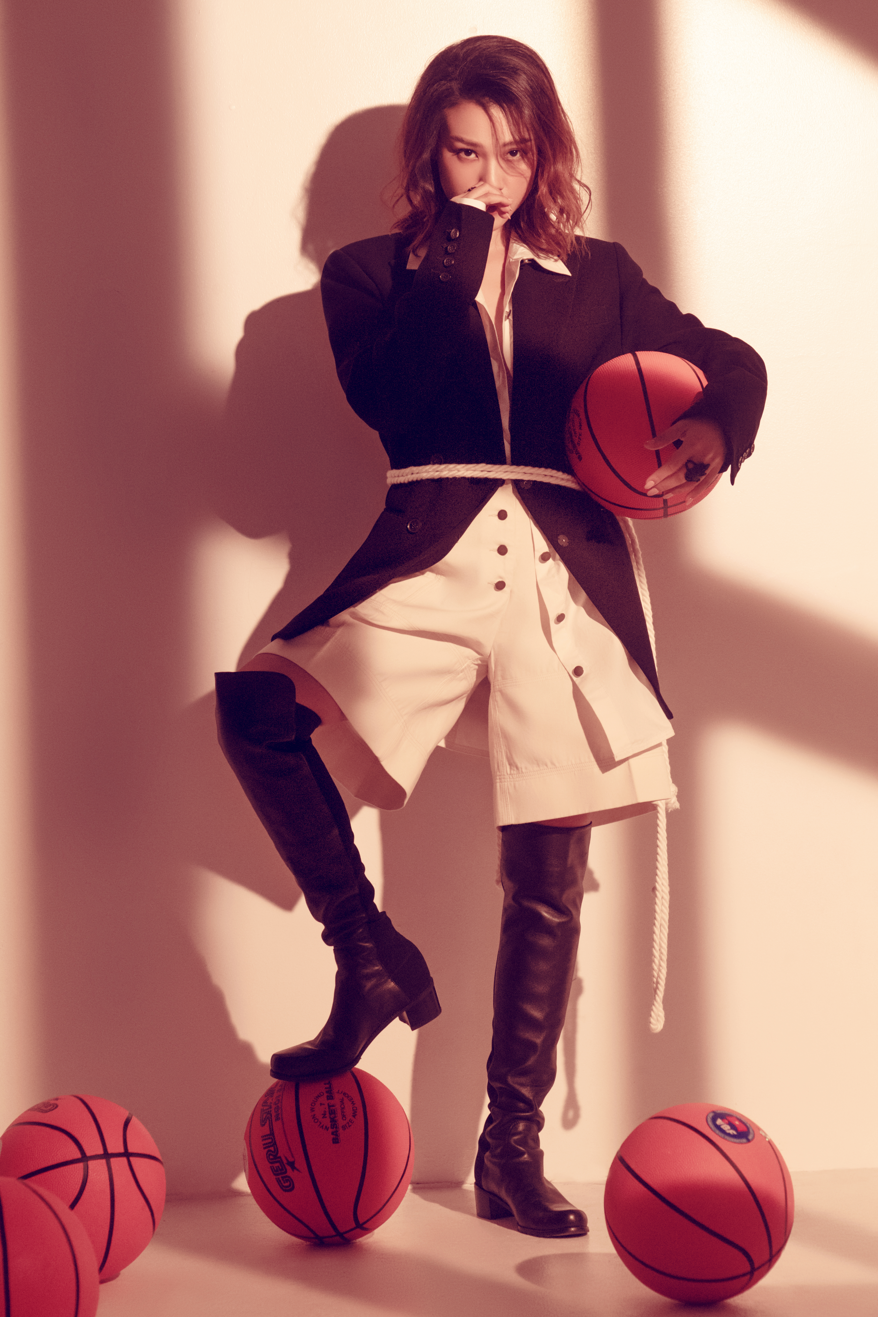 Với concept tạo dáng bên cạnh những đạo cụ như bóng rổ, thùng xốp, kềm cắt điện, xe tải hàng mini - vốn là những vật dụng quen thuộc của đàn ông, Hoàng Oanh muốn nhấn mạnh, mạnh mẽ ko phải là khô cứng và ko còn là phụ nữ.