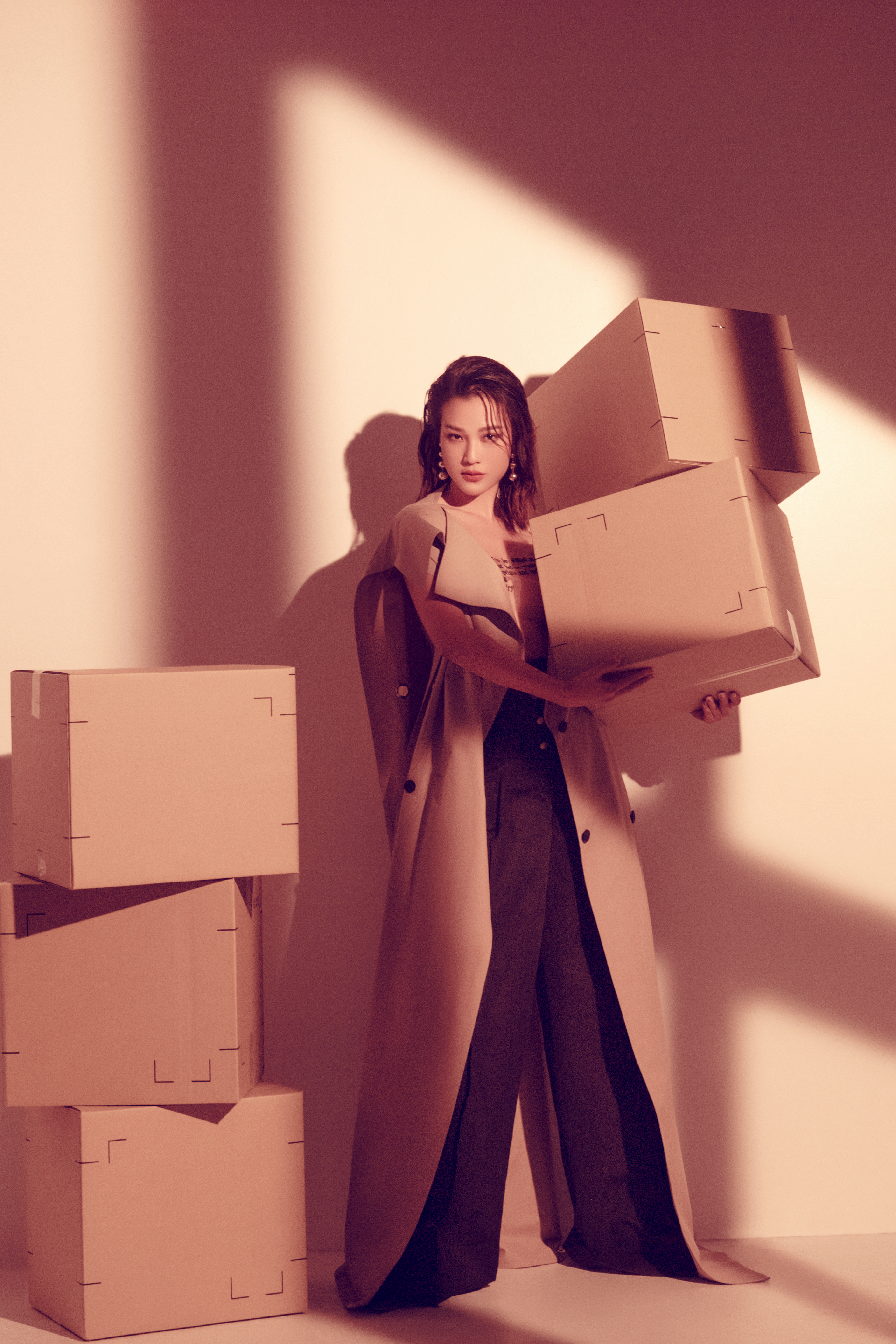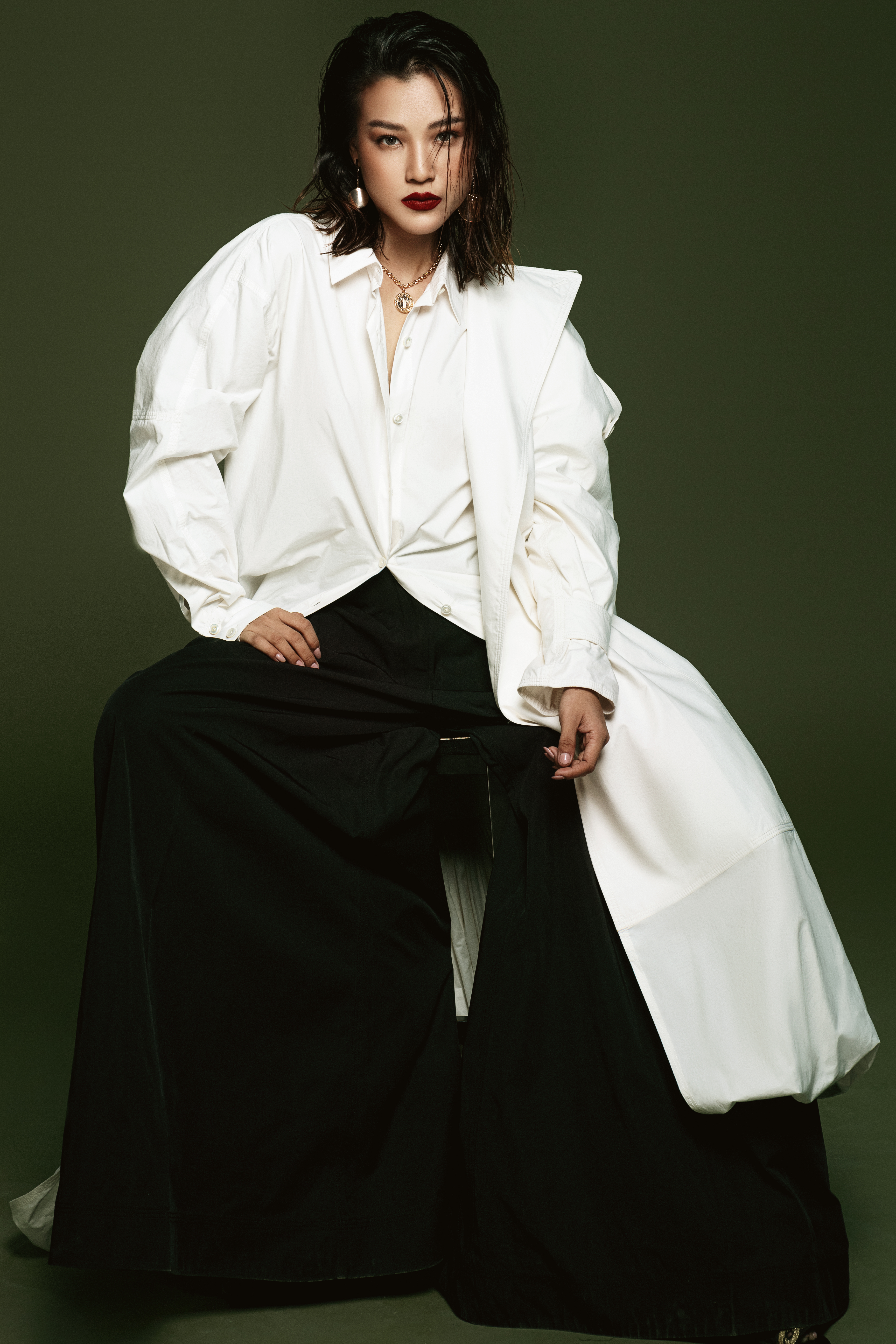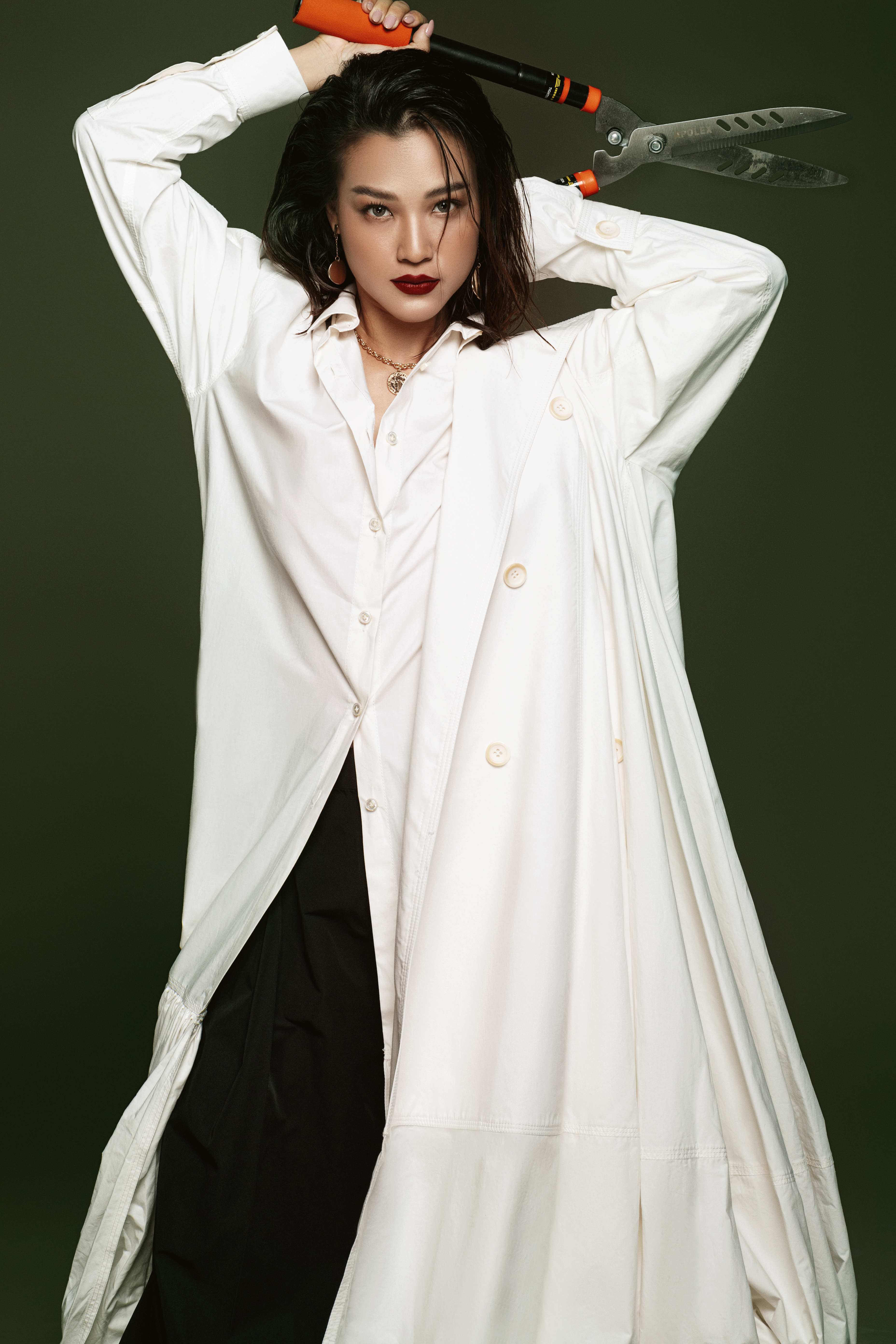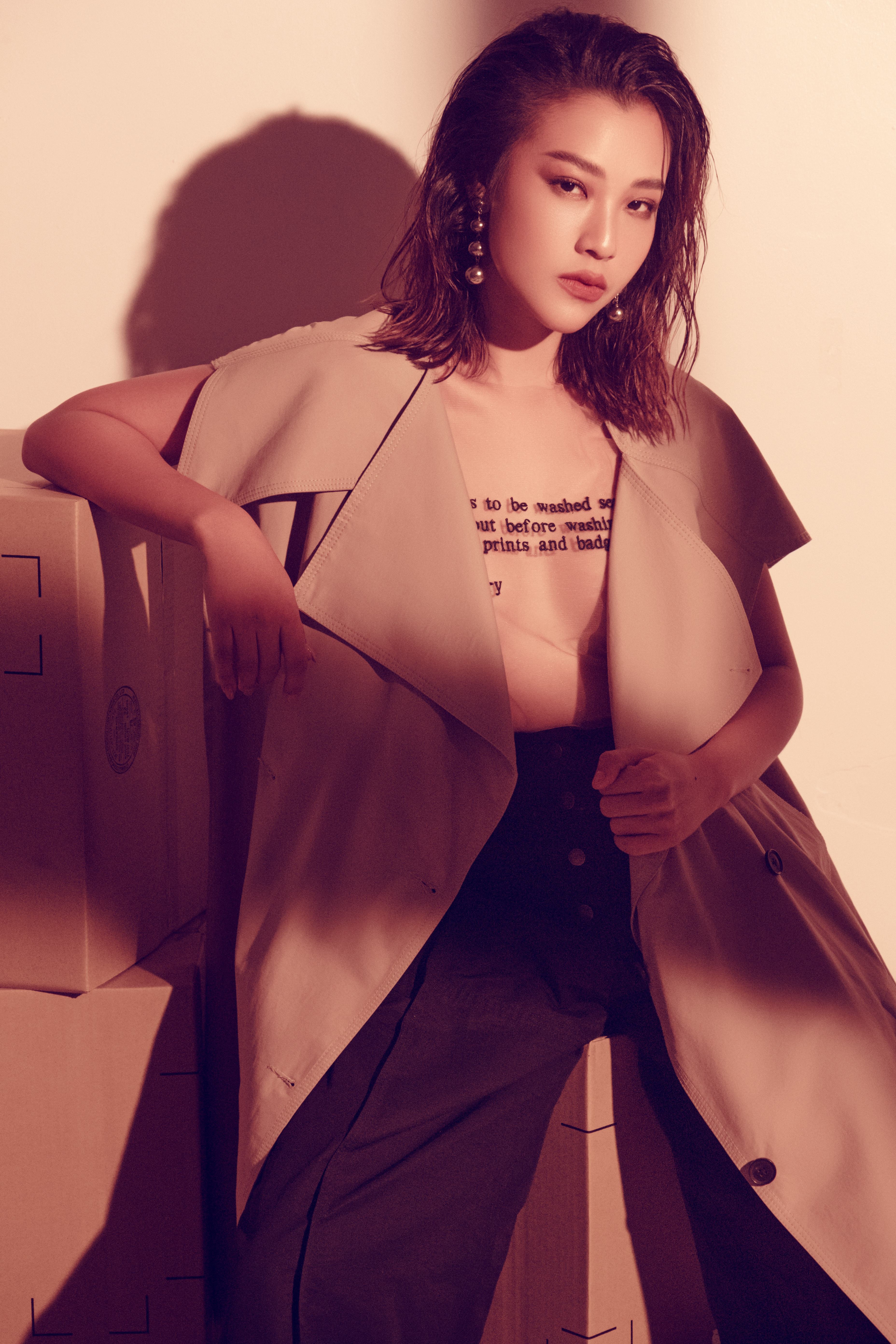 Câu chuyện về người phụ nữ bản lĩnh nhưng vẫn rất quyến rũ, gợi cảm còn được thể hiện rất khéo qua lối mix, match trang phục. Chọn những item menswear như: Vest, áo chemise hay quần âu… nhưng được mặc với croptop khoe khuôn ngực gợi cảm, hoa tai bản to nhấn nhá mang đậm tính “nữ”… Hoàng Oanh đã mang đến cái nhìn khác lạ, tưởng đối nghịch nhưng lại vô cùng hài hòa, tạo nên những shoots ảnh ấn tượng, truyền tải ý nghĩa bộ hình một cách rõ nét.