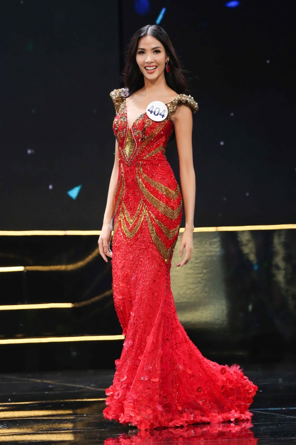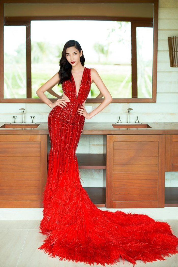 Ngay từ khi có ý định rẽ hướng sang thi nhan sắc, người đẹp đã “phải lòng” những bộ cánh đỏ rực như thế này. Cô thường chọn những thiết kế xuyên thấu được nhấn nhá khéo léo để không những khoe vóc dáng mảnh mai mà còn phát huy chiều cao nổi bật.